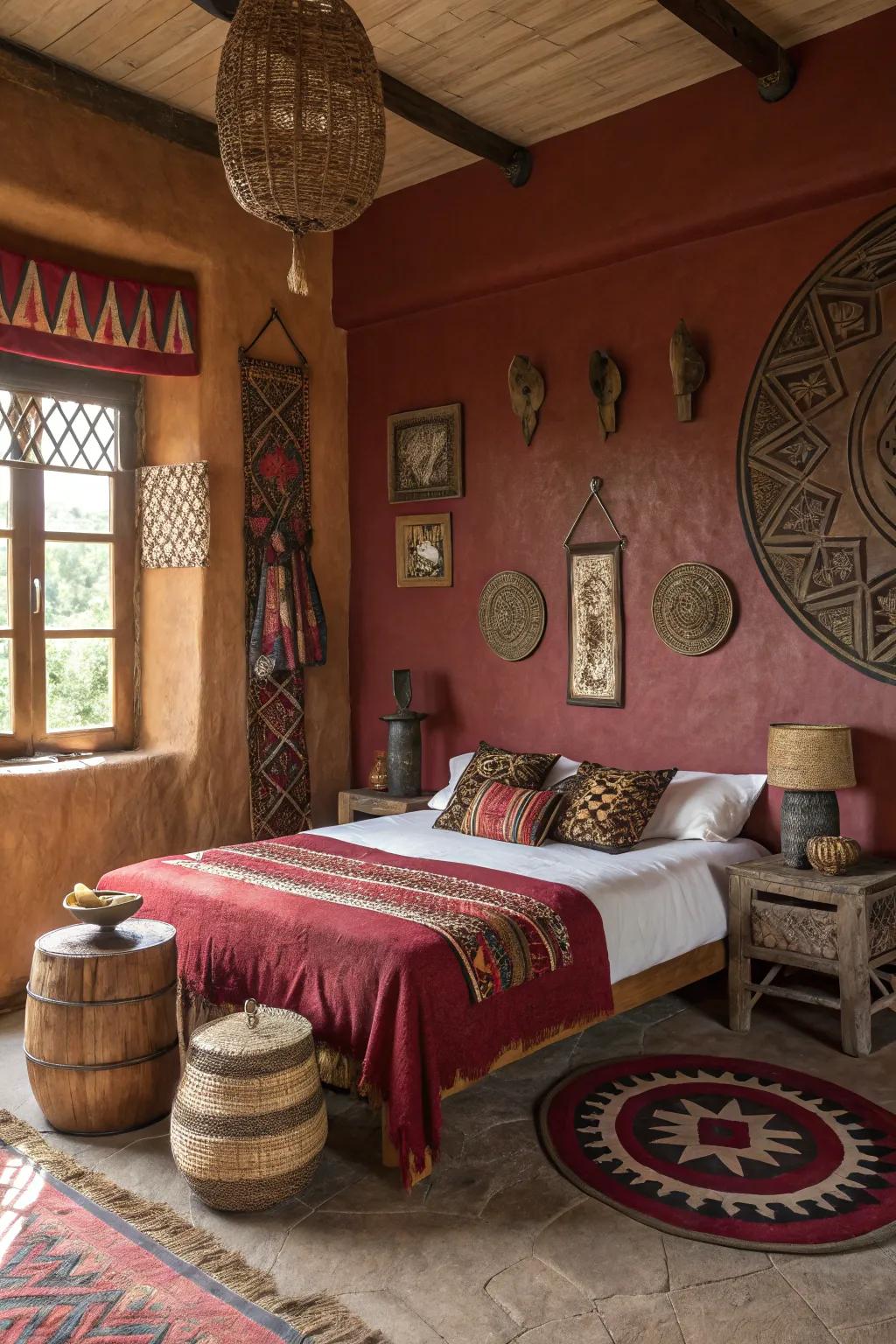 A bedroom featuring a rich, earthy color palette with African decor accents.