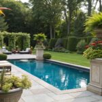 Create a cozy, elegant space with white lounge chairs and plush white cushions surrounding your pool. Arranging your furniture is a key part of many pool surround ideas. It’s like bringing a slice of luxury resort leisure right into your backyard!