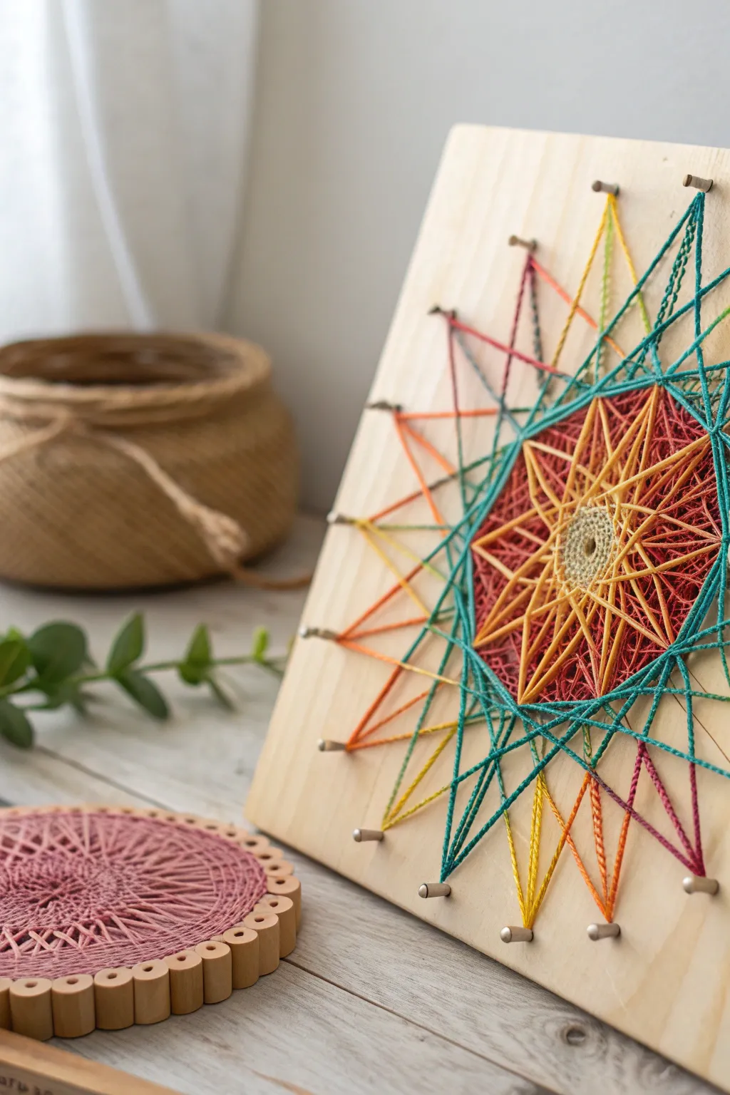 Use nails and colorful string to craft intricate string art designs. It’s a striking way to express creativity and make a statement piece.
