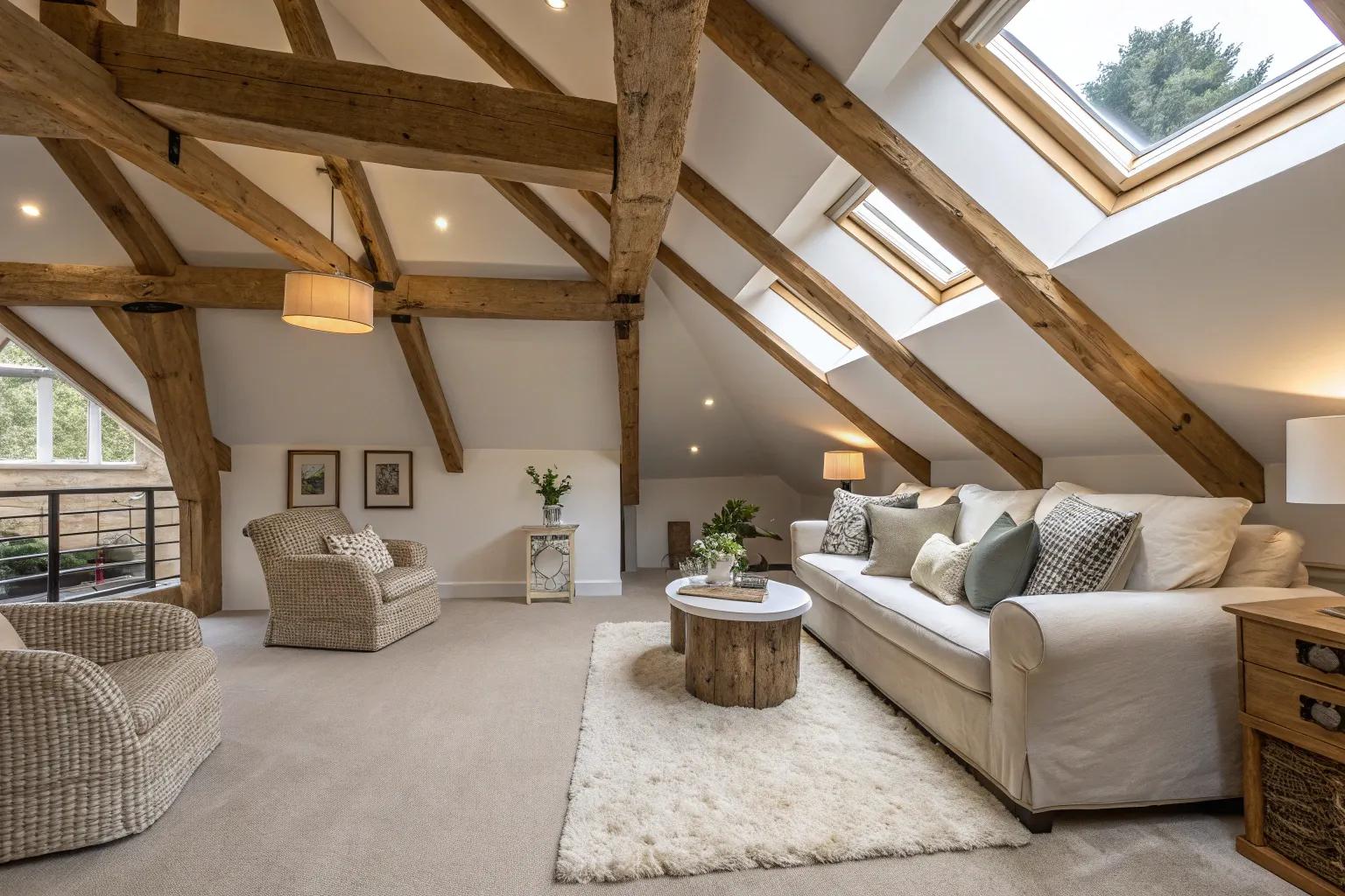 • Exposed Wooden Beams: Add rustic charm with exposed wooden beams; enhance your attic’s character instantly.