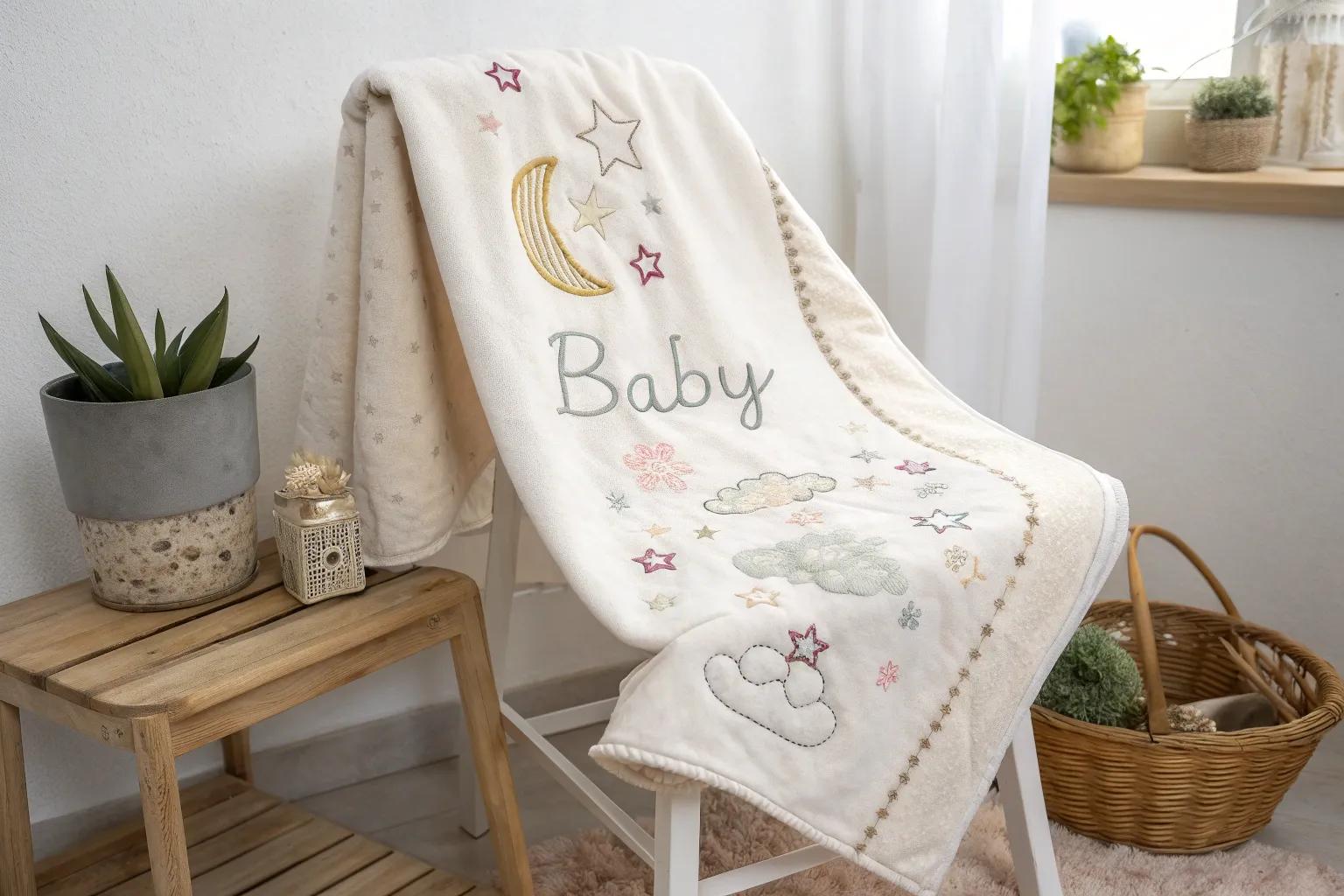 - Soft Blue Baby Blanket for Embroidery: Start your celestial theme on a soft, high-quality blue blanket ready for your personal touch.