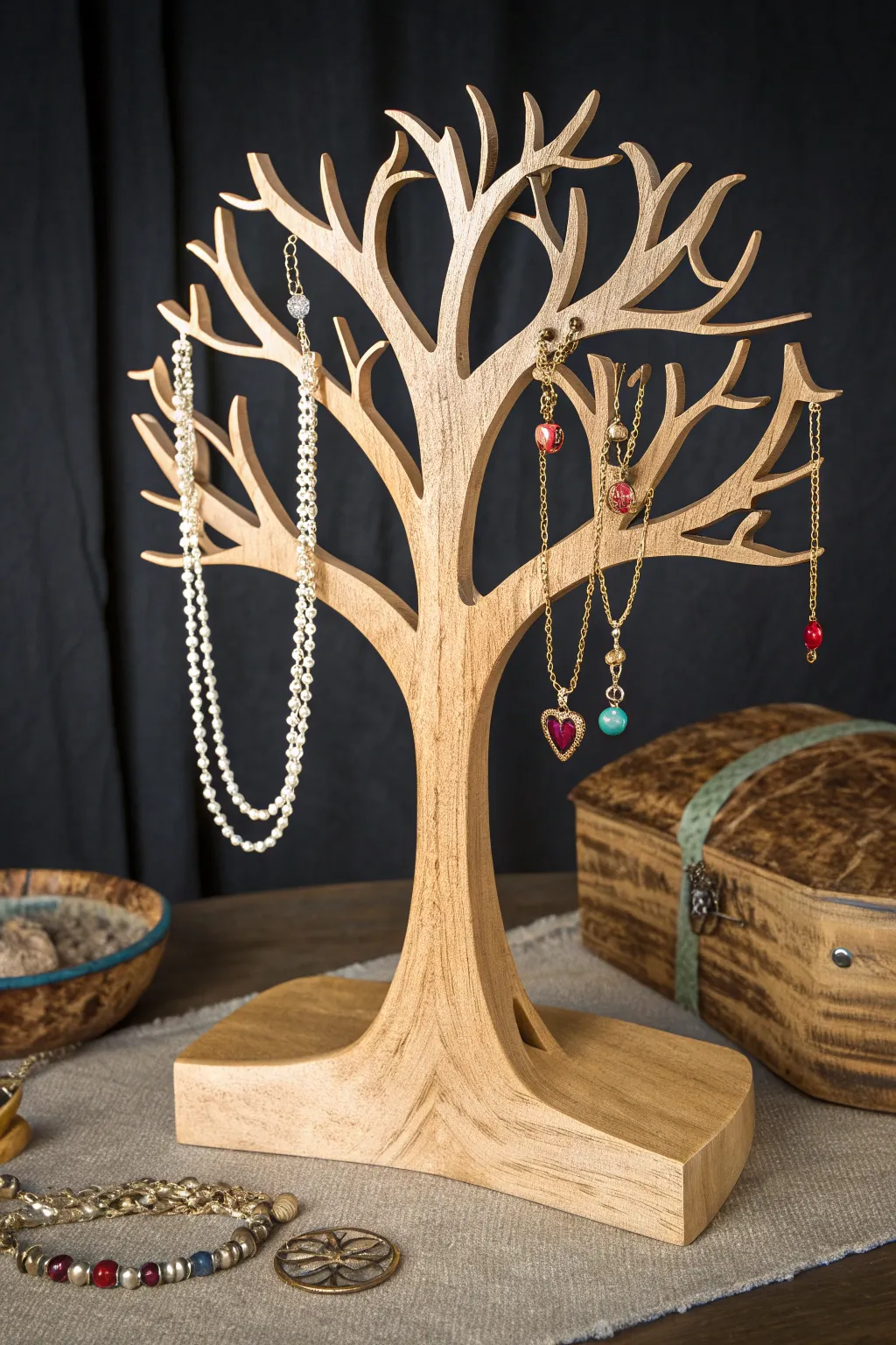 Create sculptural jewelry holders that are both practical and beautiful. I’ve designed a tree-like holder that elegantly displays my necklaces.