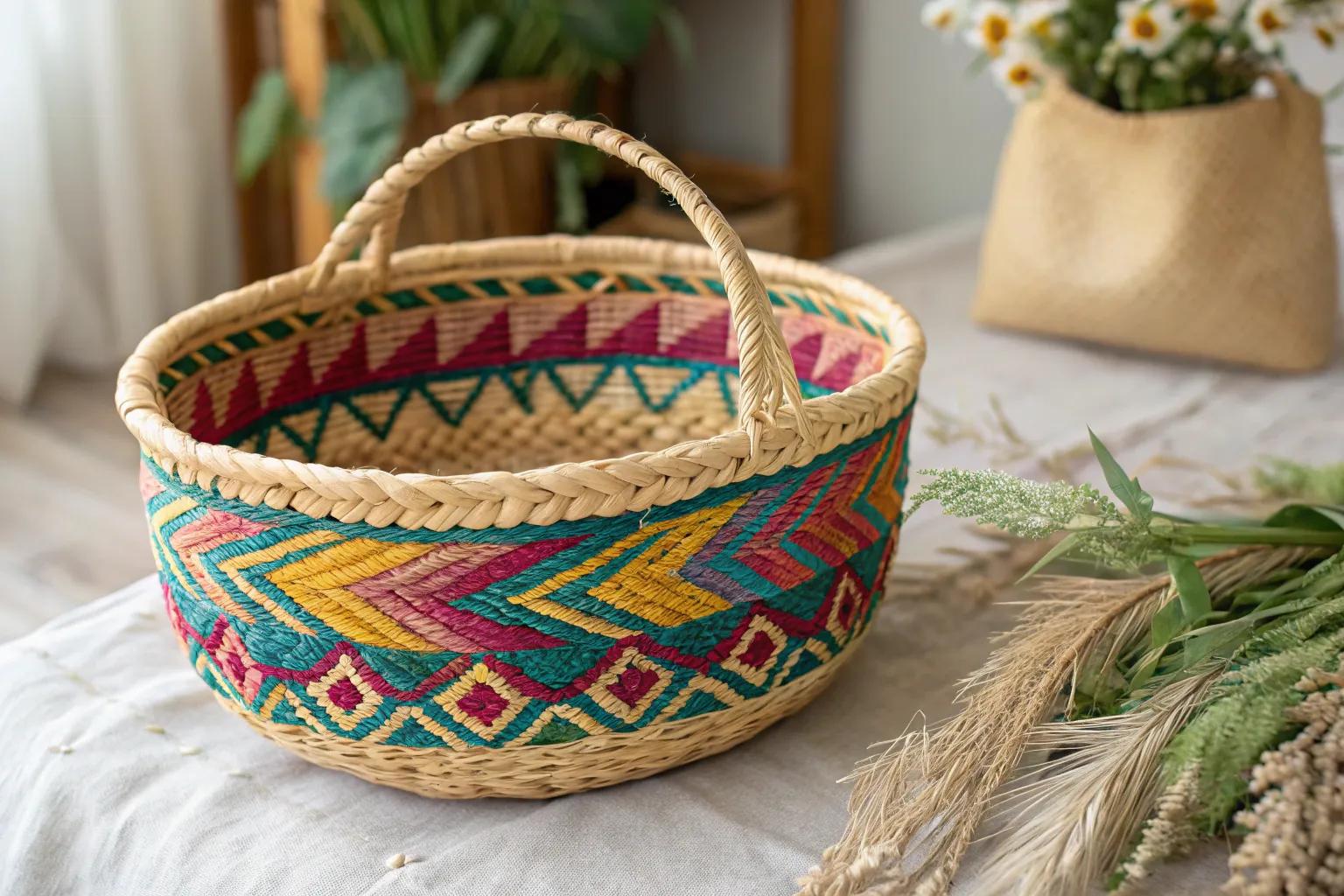 Weave ribbon through the gaps of an open weave basket for a fresh look. It’s a simple update that adds charm and color, perfect for many woven flower basket designs.