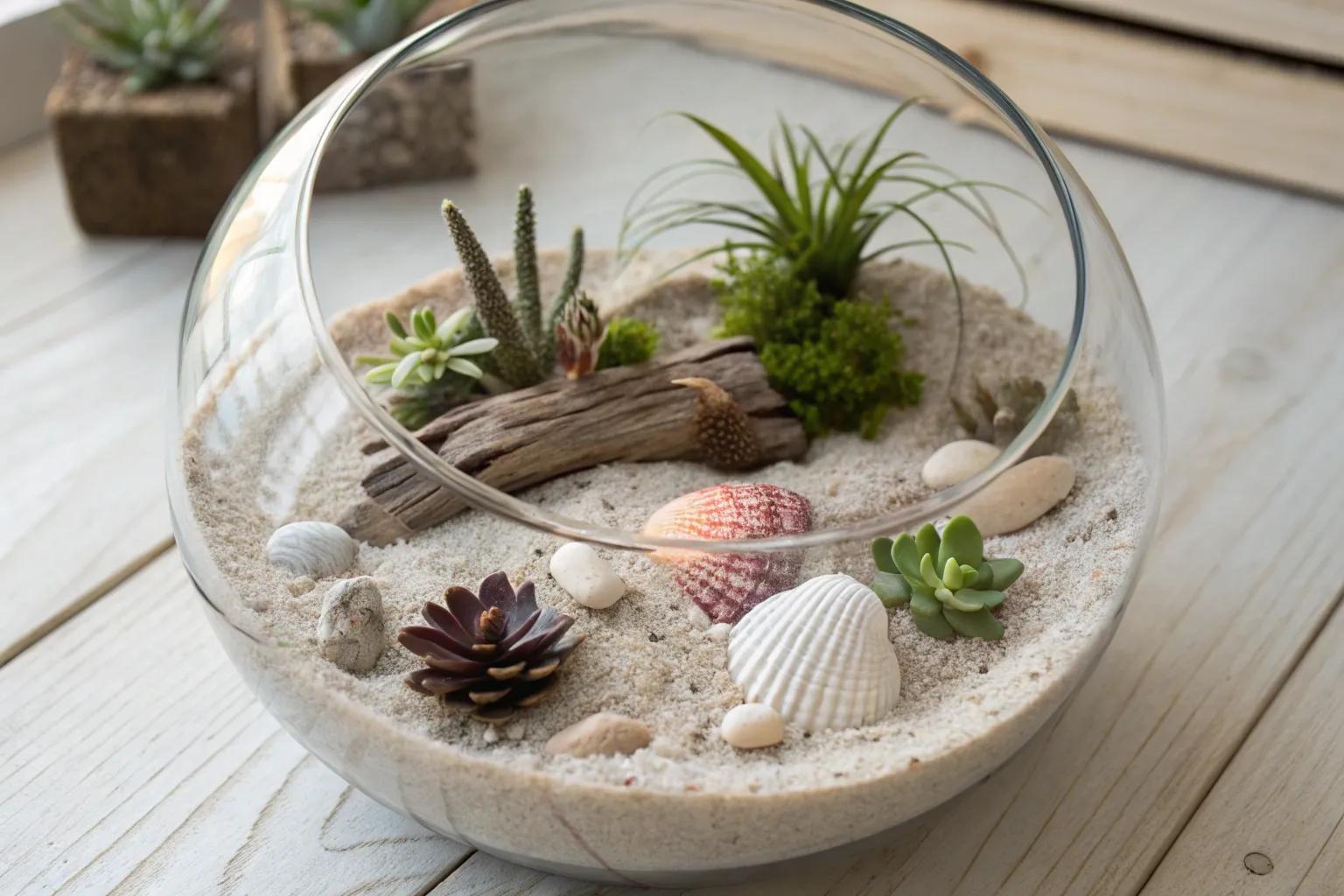 Start with a clear glass globe to showcase your beach scene from every angle. This type of container is also perfect for these delightful fairy terrarium ideas. I once used an old fishbowl, and it instantly turned into a conversation starter!