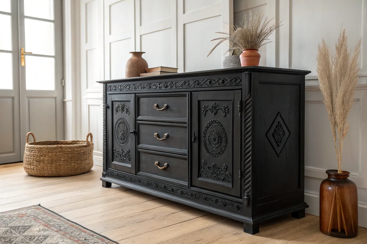 I rescued an old sideboard from a yard sale and gave it a sleek update with black chalk paint. It’s now a chic addition to my dining room, perfect for entertaining.