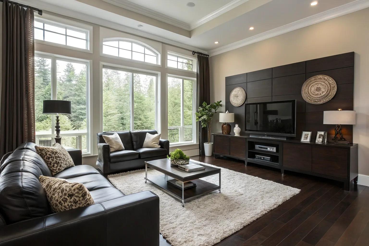 Achieve a striking effect by balancing bold black accents with soft white walls and rich brown furniture. This high-contrast palette creates a dynamic yet harmonious space, a favorite strategy in my design projects.