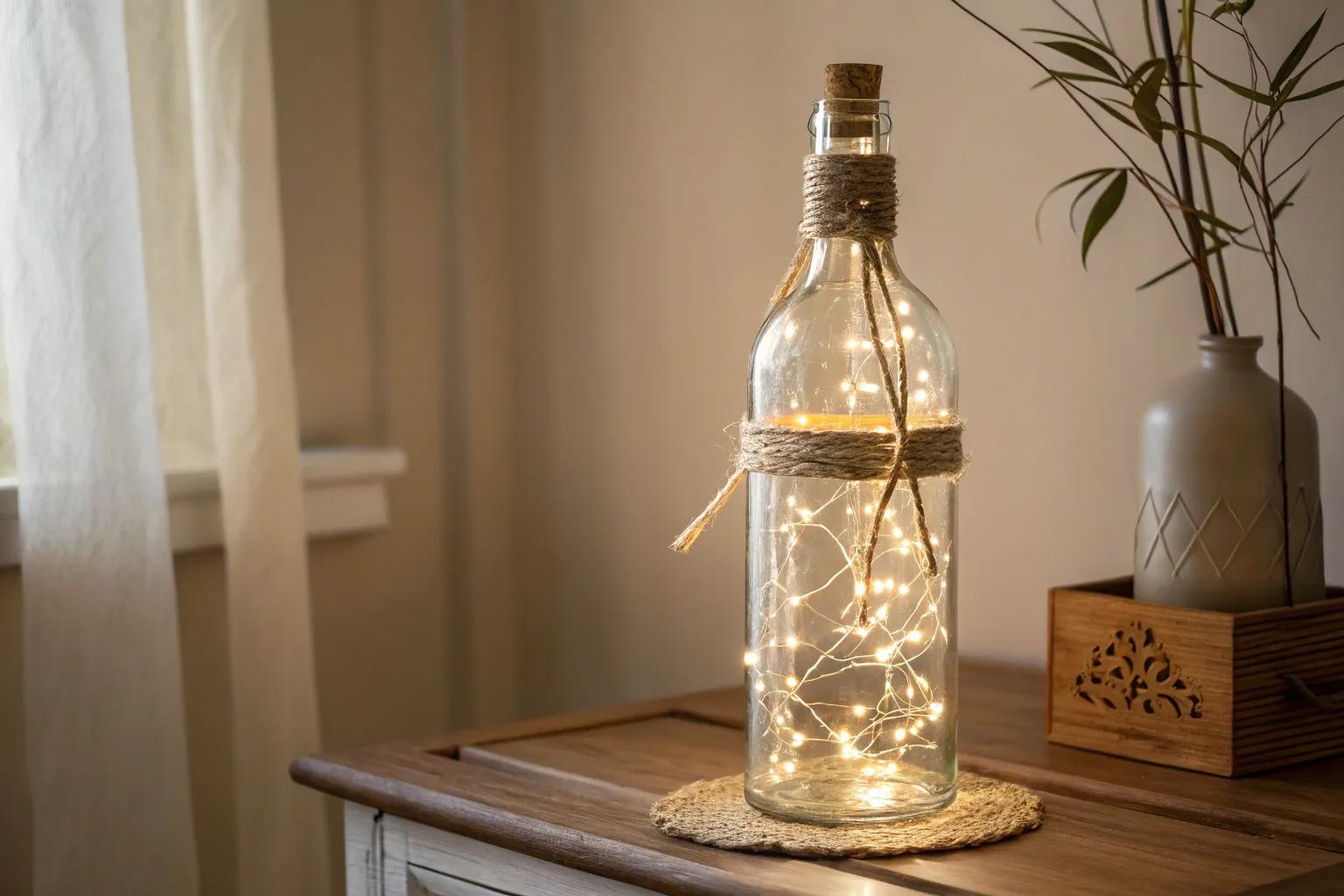 Stuffing a string of fairy lights inside a bottle creates a magical glow that’s perfect for a cozy evening. I love using these in my living room to add a touch of whimsy.