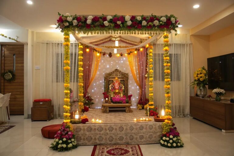 Ganesh Chaturthi is a time of joy and reverence, celebrated with beautiful decorations that honor Lord Ganesha. I’ve put together some of my favorite ideas to help you create a stunning setup at home. 1. Light Up the Celebration Fairy lights add a magical glow to this Ganpati mandap. Adding fairy lights or LED strips can instantly elevate the ambiance of your Ganpati decoration, a popular trick in many creative DIY room decoration ideas. I…