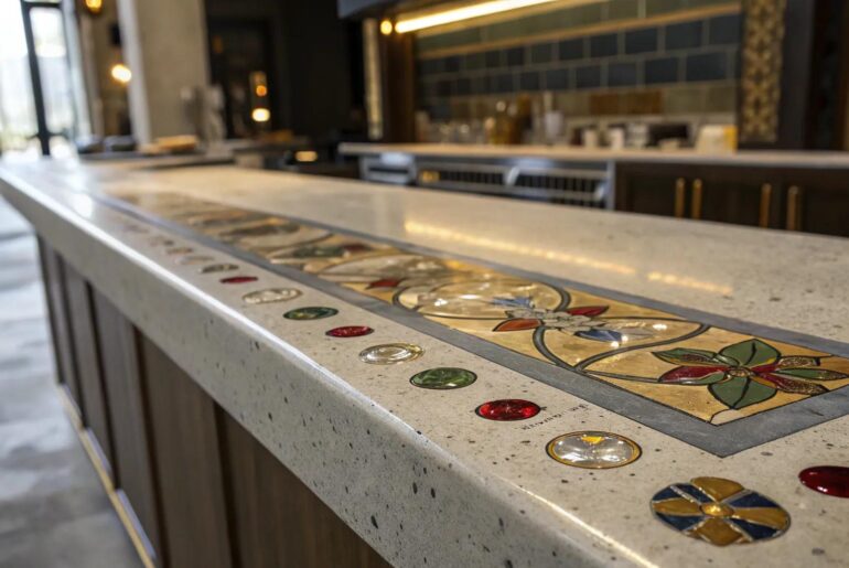 Concrete countertops are the perfect canvas for a touch of artistic flair in your home. Whether you’re revamping your kitchen or adding a unique element to your bathroom, there’s an inlay idea here to spark your imagination. 1. Colorful Glass Pieces Transform your space with a stunning mosaic of colorful glass inlays on a concrete countertop. Brighten up your space with colorful glass pieces inlaid into the concrete. It’s like having a permanent mosaic art…