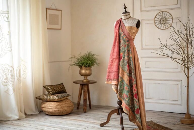 If you’re like me, you’ve probably got a stash of old sarees tucked away, too beautiful to discard but not quite wearable as is. Let’s dive into some creative ideas to transform those cherished fabrics into stunning fashion pieces. 1. Draped Cocktail Dress Effortless elegance: Transform vintage saree fabric into a chic draped cocktail dress. A cocktail dress made from saree fabric is effortlessly elegant. I once draped a saree around myself for a no-sew…