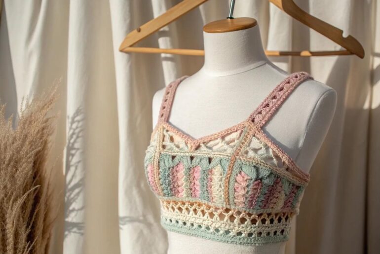 Crocheting your own crop top is a delightful way to add a personal touch to your summer wardrobe. With so many styles and patterns to choose from, you’ll be ready to flaunt your handmade fashion in no time. 1. Floral Motif Crop Top Embrace nature’s elegance with this Floral Motif Crop Top, a perfect blend of craftsmanship and style. Incorporate nature into your wardrobe with a Floral Motif Crop Top. I crocheted mine with pastel…