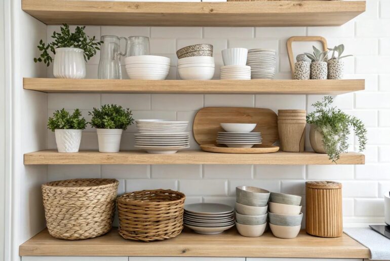 Creating open shelving in your kitchen is like opening the door to endless design possibilities. Let’s dive into some inspiring DIY ideas that will bring warmth and personality to your culinary space. 1. Mix Materials for Texture Elevate your kitchen style with a perfect mix of metal and ceramic for a chic, minimalist vibe. Combine different materials like metal and ceramic to create interest. I love the contrast of my ceramic bowls against industrial metal…