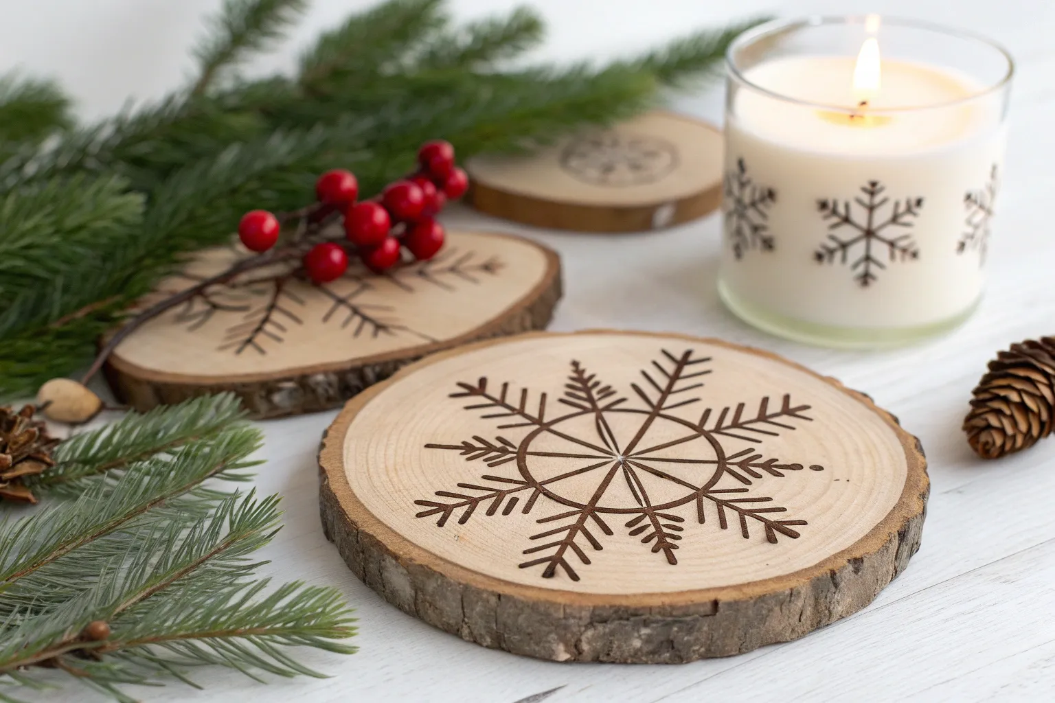 Add a touch of natural elegance to your holiday decor with handcrafted wood-burned coasters. #ScandinavianBoho #HolidayCrafts