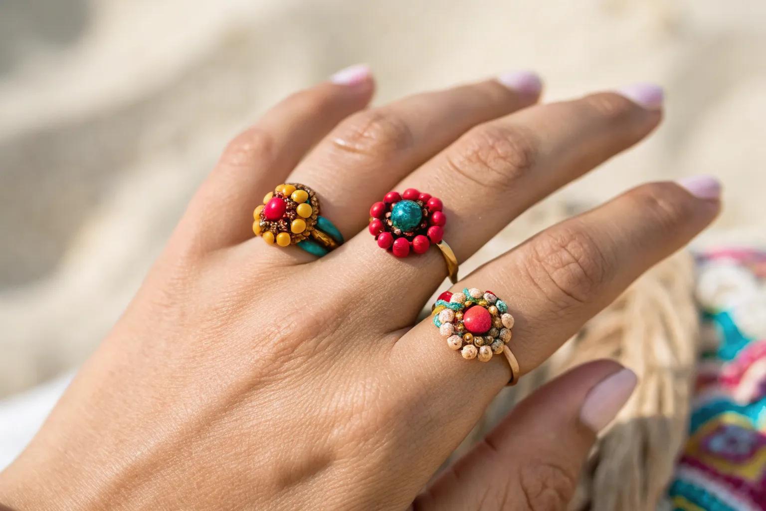 Craft a series of stackable rings in complementary colors for a trendy, layered look. I love wearing these stacked beauties on a sunny day out.