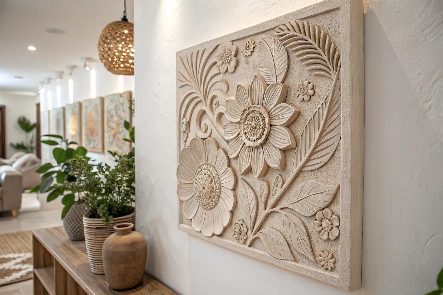 Create a gallery effect by arranging multiple artistic panels in a cohesive theme. A friend of mine used a series of small reliefs to form a stunning mosaic for her living room, inspired by her travels.