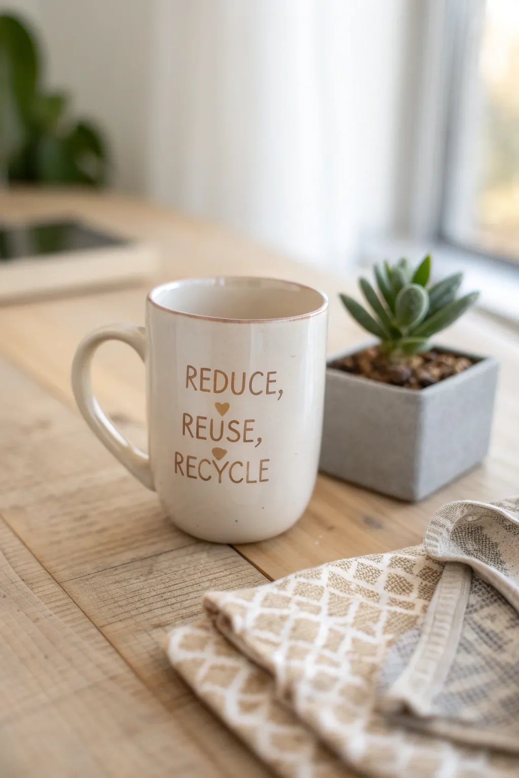 Promote sustainability with eco-friendly statements. My ‘Reduce, Reuse, Recycle’ mug is a daily reminder of my green intentions.