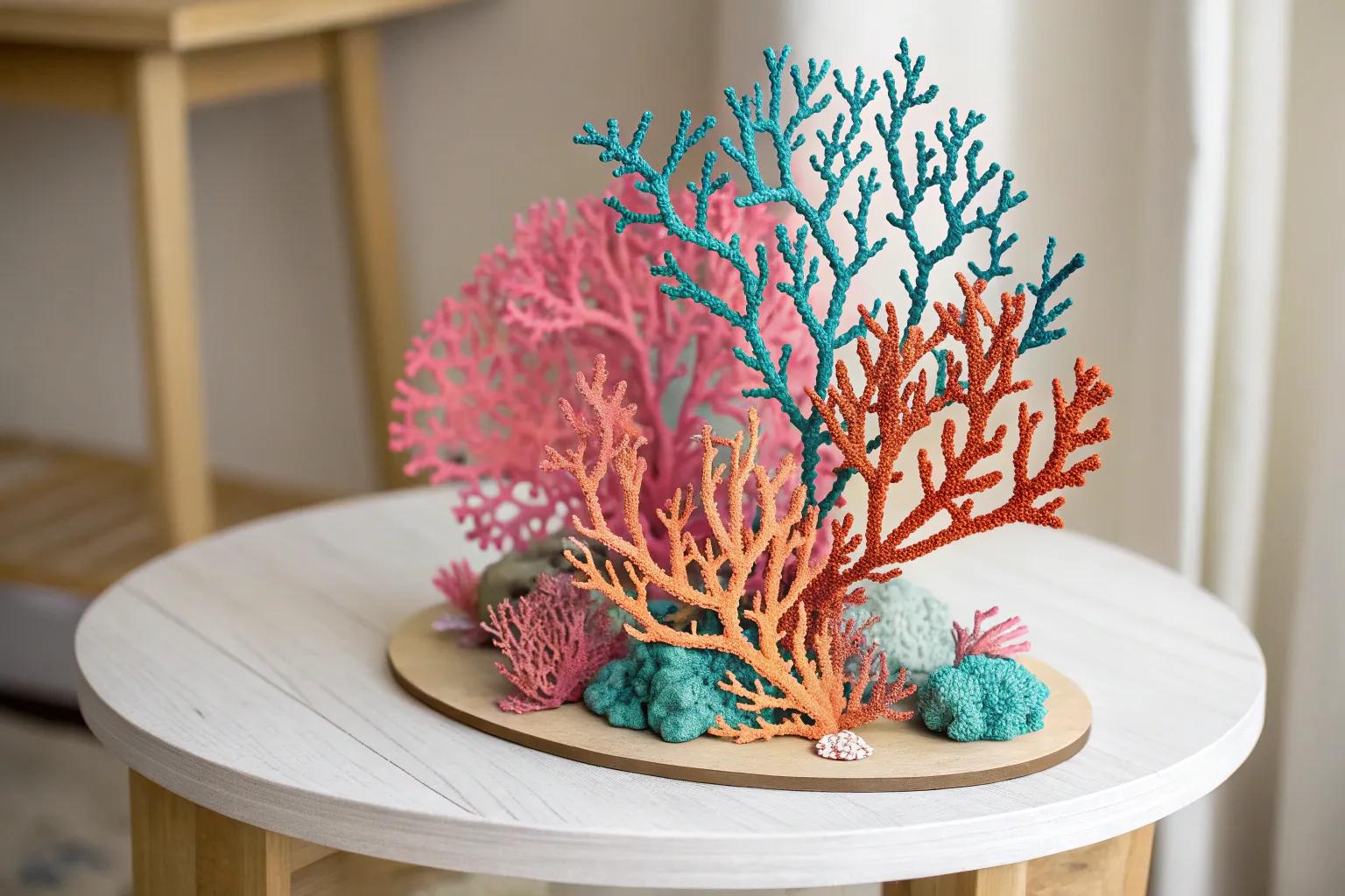 Wrap and knot yarn into intricate coral shapes, introducing a cozy and handcrafted element to your coral reef display. This technique works well alongside other enchanting mermaid craft ideas.