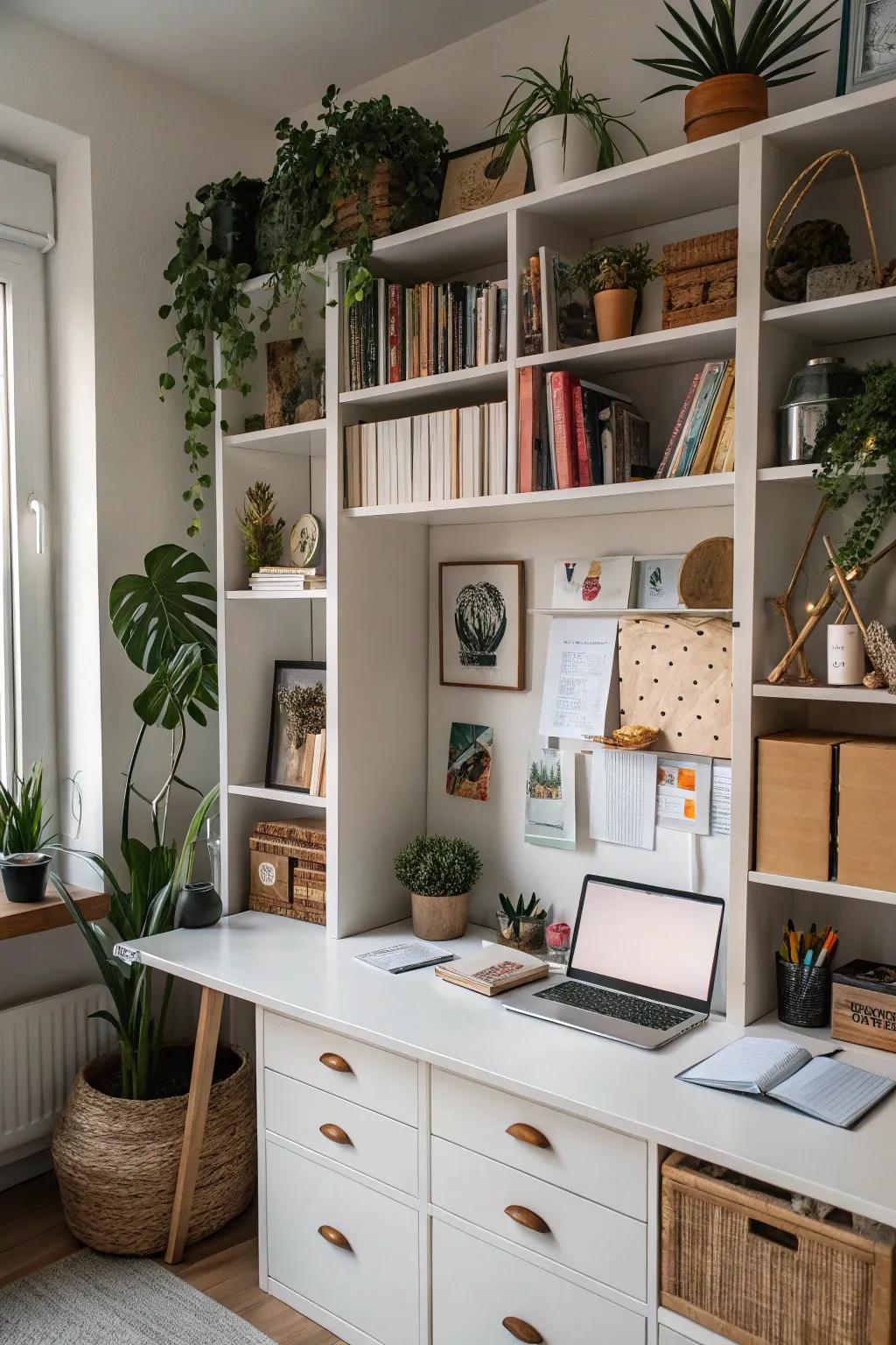 Use storage as an art display by arranging items creatively. I enjoy turning storage into a visual feature that enhances the aesthetic of the office.