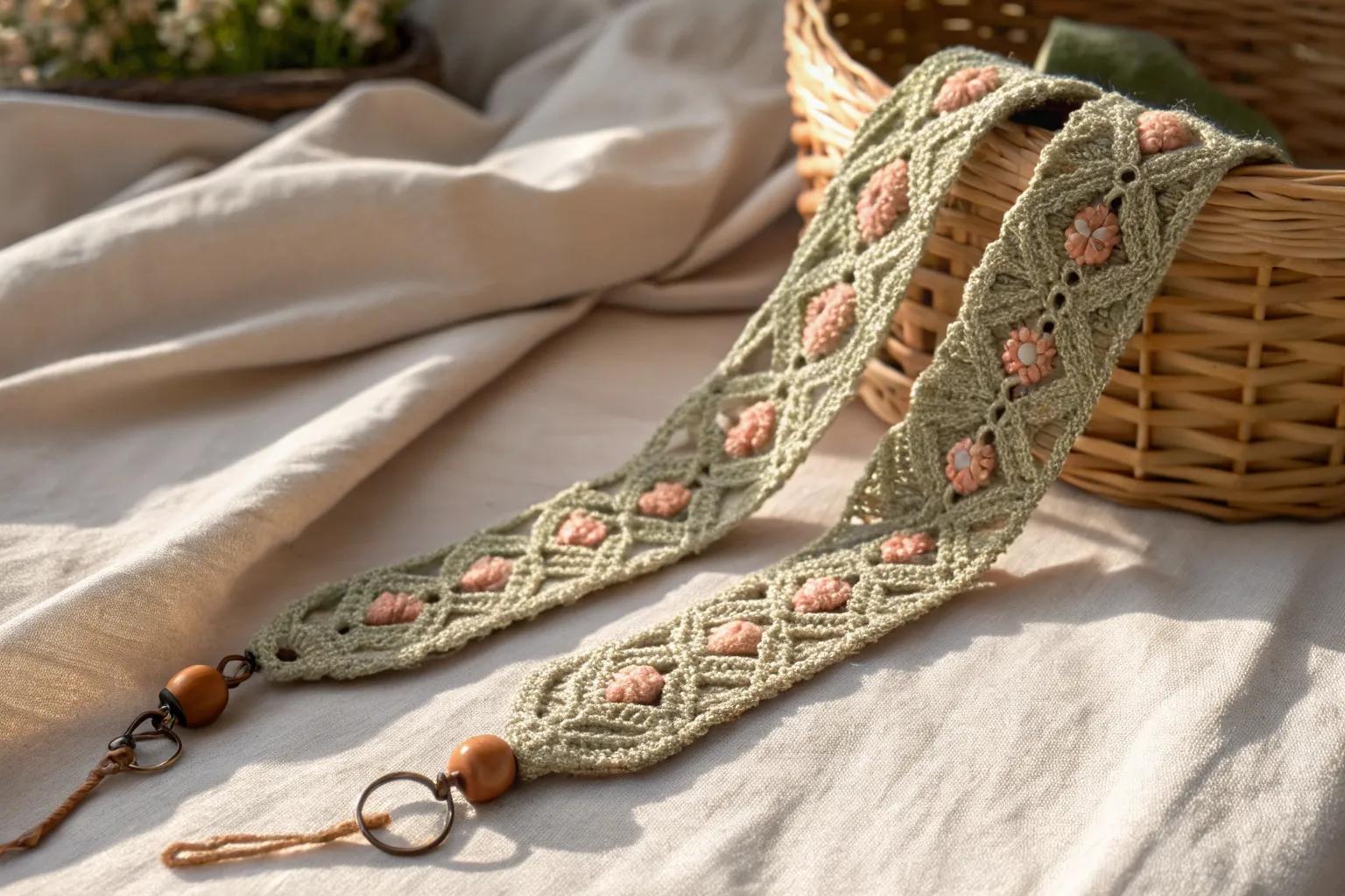 Merge crochet with macramé techniques for a strap that’s uniquely yours. By alternating between crochet stitches and macramé knots, you can create a standout design for your favorite crochet accessories.