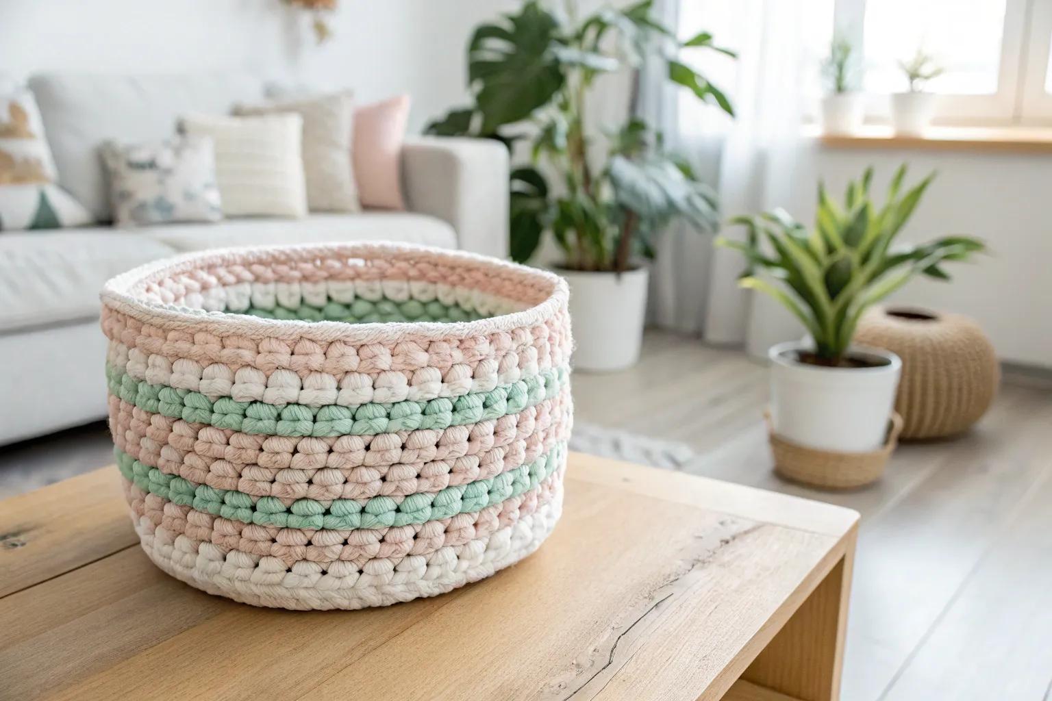 Create a vibrant color block basket by combining bold yarns. I once made one in mustard and teal, and it added such a cheerful pop to my entryway!