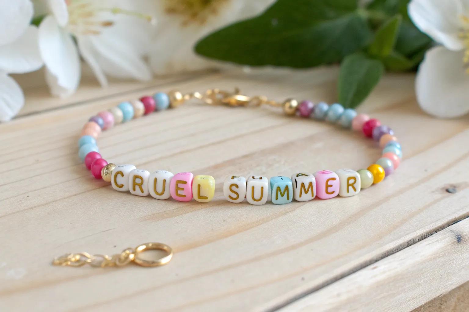 Spell out ‘CRUEL SUMMER’ with alphabet beads for a playful nod to the season. It’s a simple yet eye-catching way to express your summer mood, and I love how it sparks conversations!