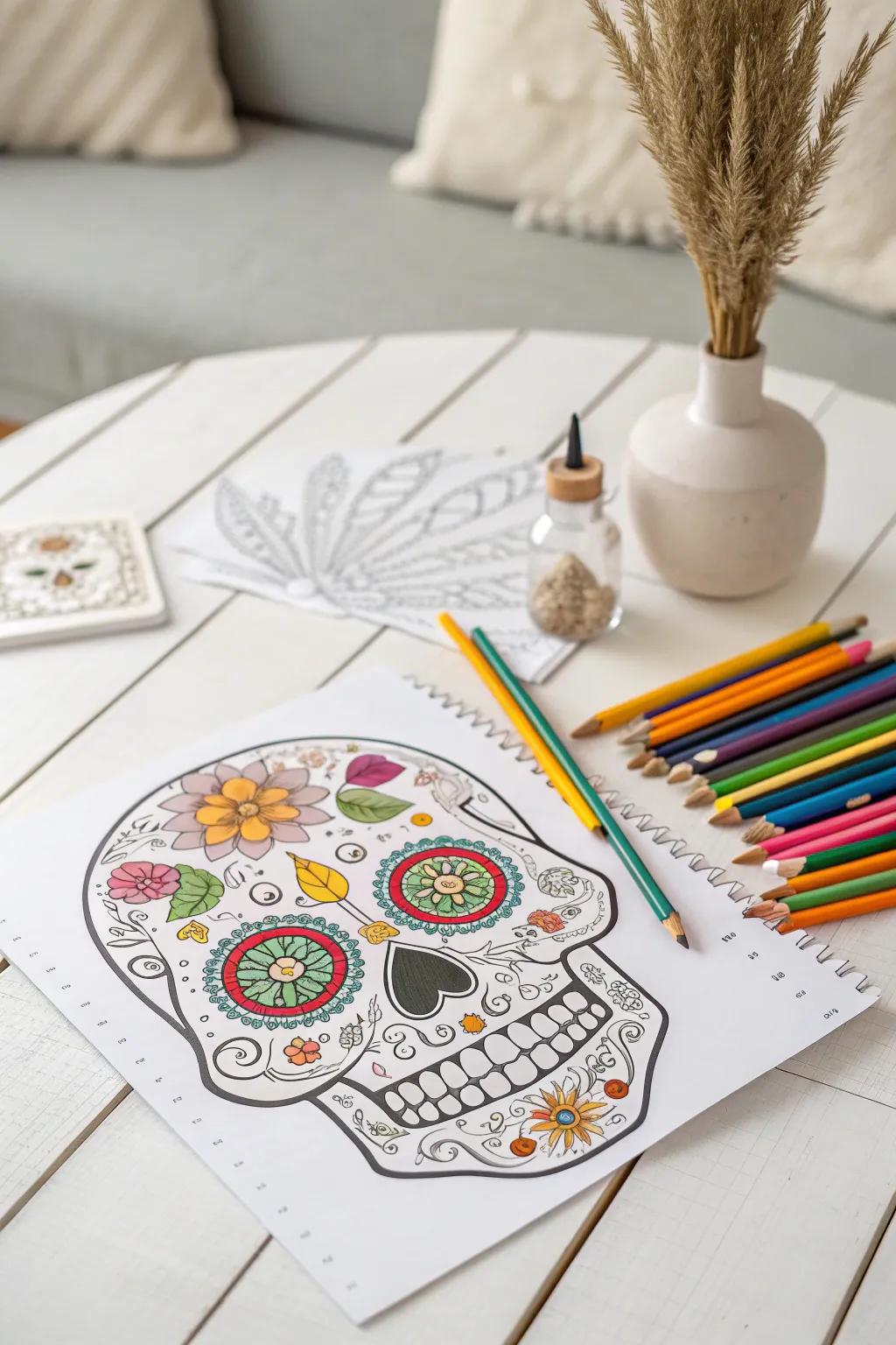 • Set of Colored Pencils: Enhance your art with vibrant colored pencils, ideal for detailed Day of the Dead coloring.
