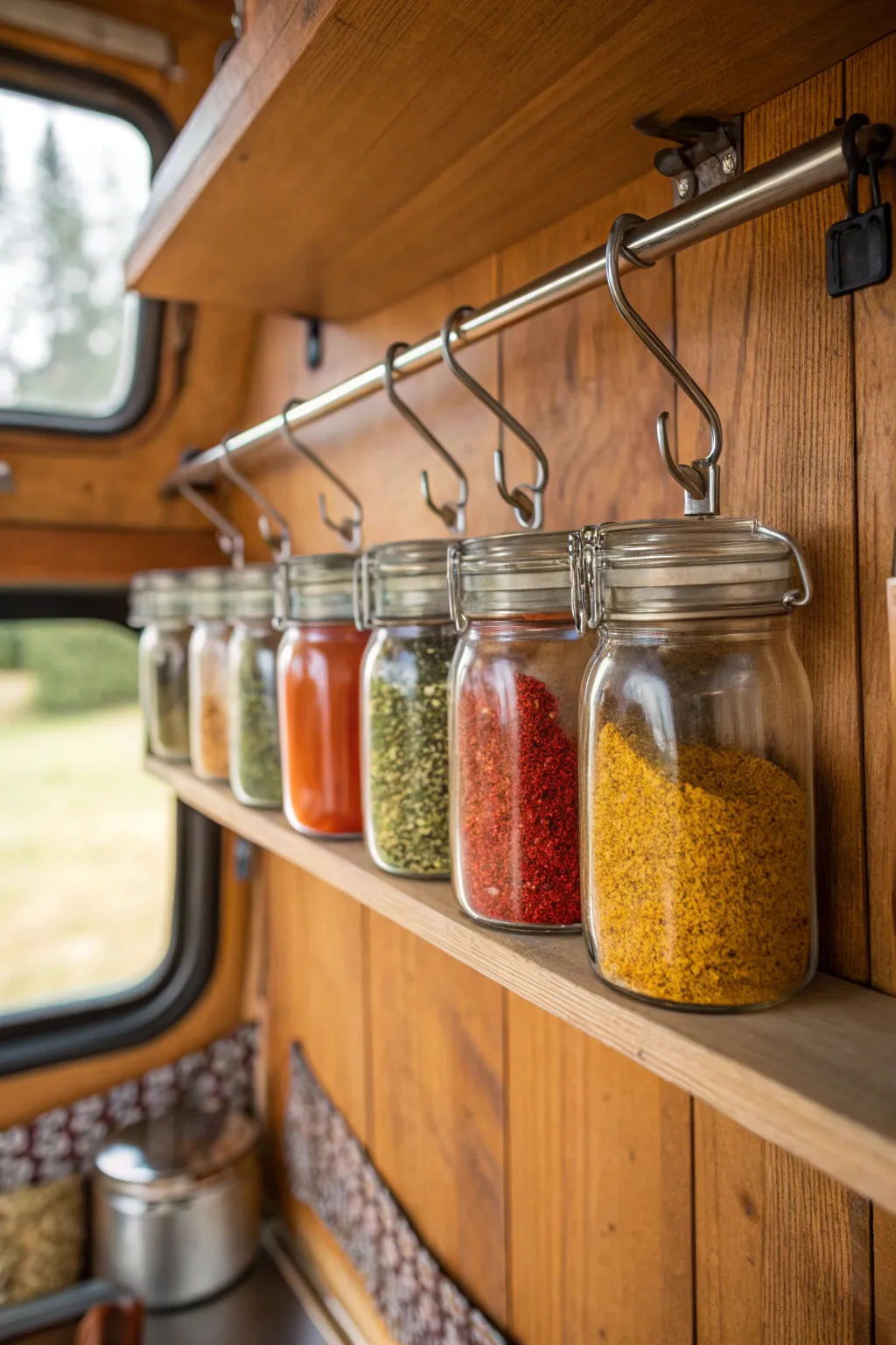 For those little kitchen essentials, why not try hanging mason jars? I love how they keep my spices visible and within arm’s reach, and they add a bit of rustic charm to my campervan kitchen.