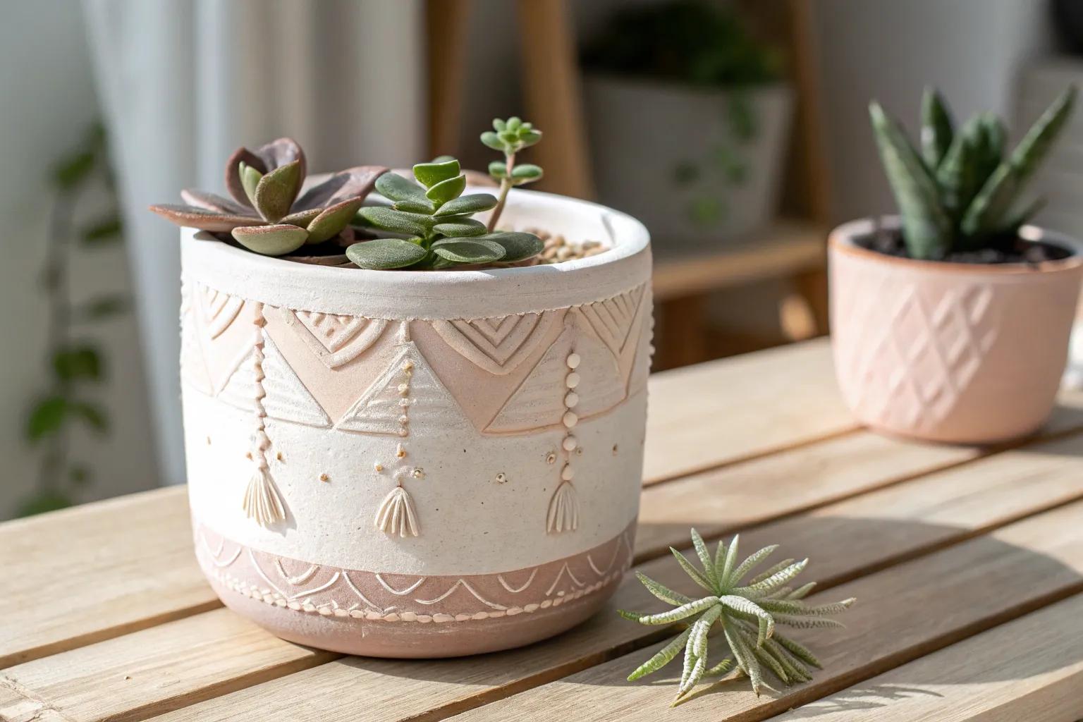 Use stamps or textured materials to press designs into your clay pots. I once used old lace to create a delicate pattern, and the result was simply stunning. Discover more boho ceramic plant pot ideas for similar effects.