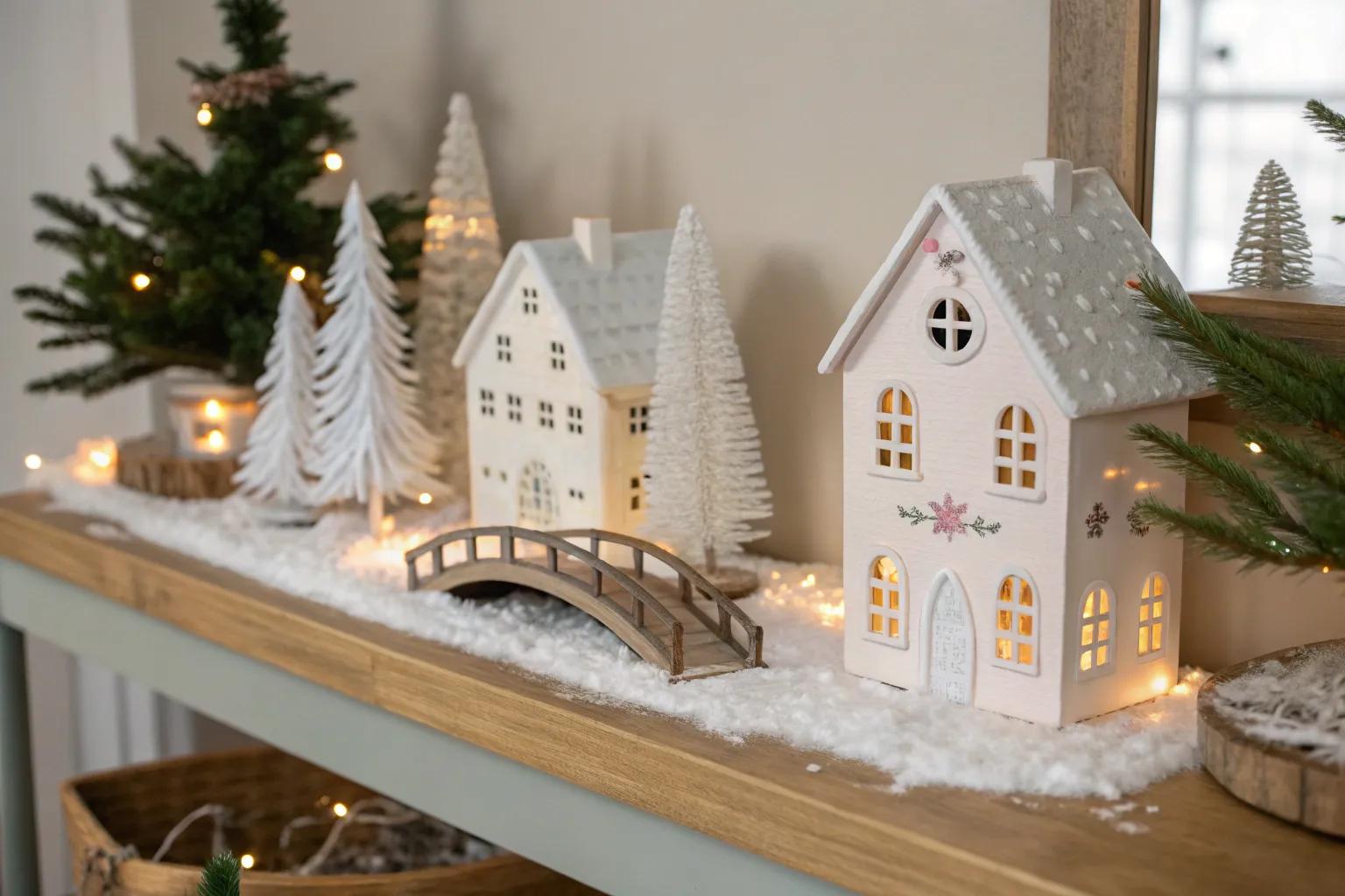 Include miniature gingerbread houses for a sweet twist. It’s fun to make them, and they add a delicious aroma to your home. Find more inspiration with these DIY Christmas village ideas.