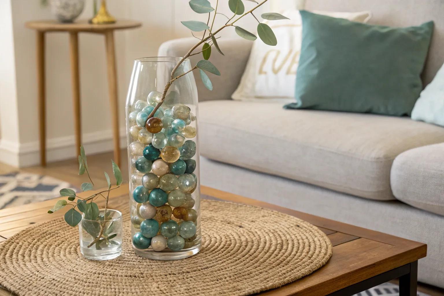Jazz up a simple vase by adorning it with colorful marbles. It’s a delightful way to bring attention to your flower arrangements.