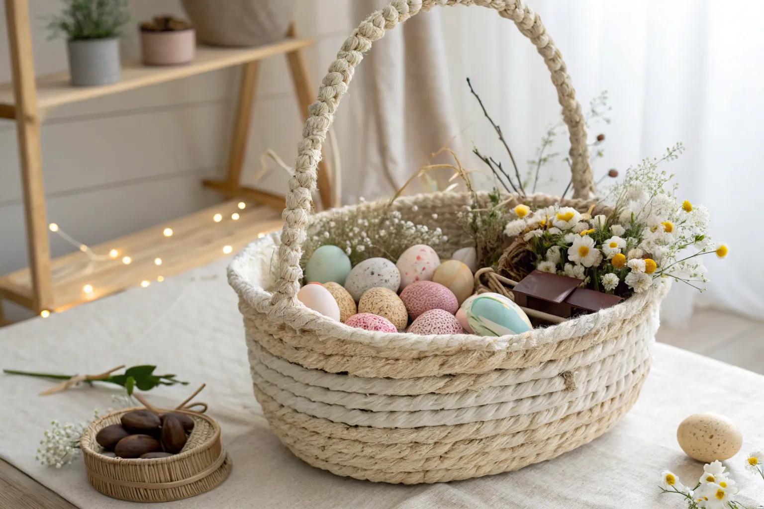 Craft a natural-looking basket using burlap and twine for a chic, minimalist design. It’s a beautiful blend of simplicity and elegance that I often use in my loft! You can find more sophisticated projects among these DIY Easter basket ideas for adults.