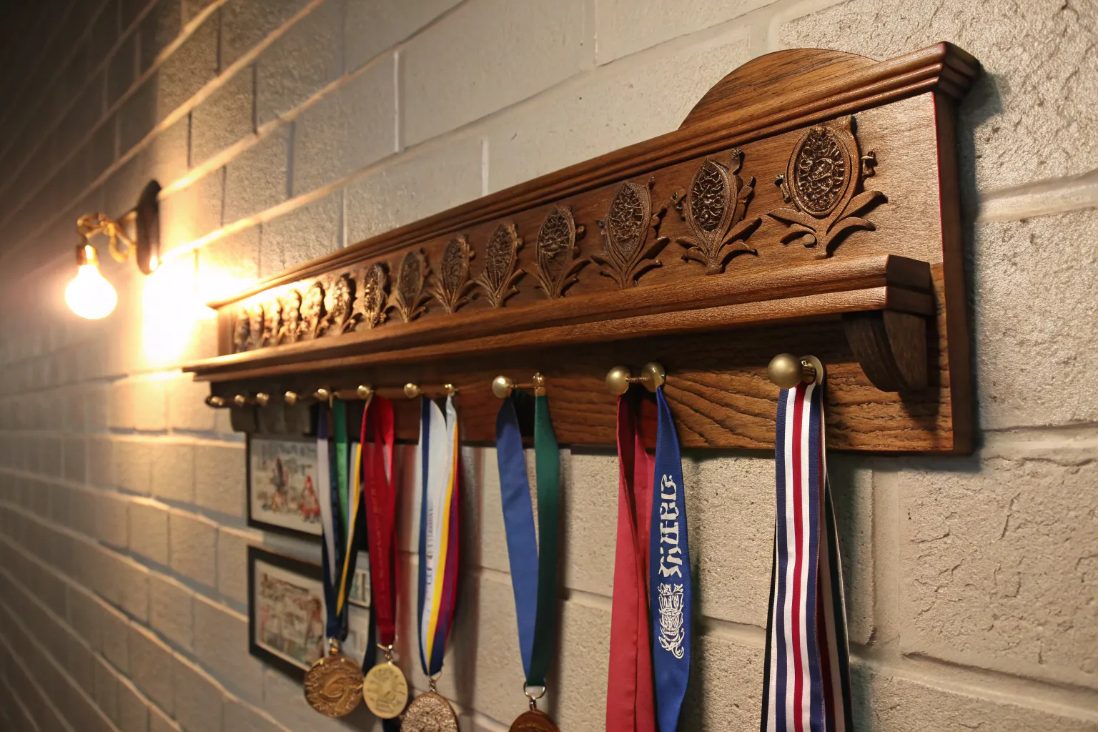 Craft a rustic wooden rack using reclaimed wood and add hooks for each medal. I adore how this adds a cozy yet personalized touch to any room, making your achievements a centerpiece of admiration.