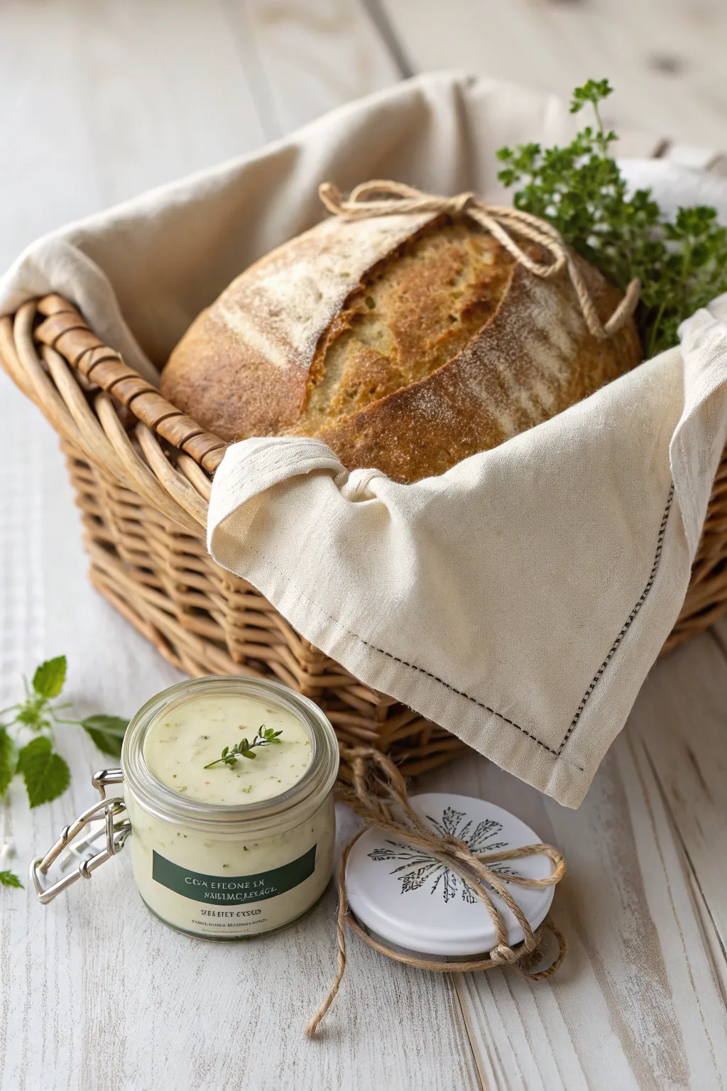 Bake a fresh loaf of bread and pair it with a small jar of homemade herb butter. Wrap in a linen cloth and tie with twine for a rustic, homemade feel. This one always gets rave reviews for its simplicity and taste.
