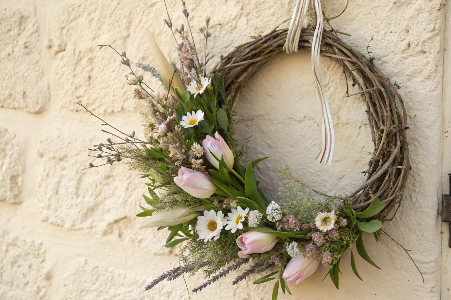 Craft a whimsical wreath with felt flowers in pastel hues. I love using felt because it’s easy to work with and adds a playful touch to any door.