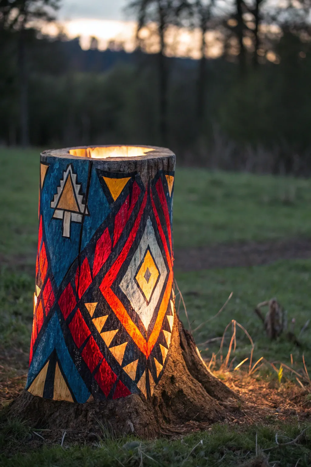 Add a touch of artistry by painting the stump with outdoor acrylics. I opted for geometric designs and watched as the lights made the colors pop at dusk.