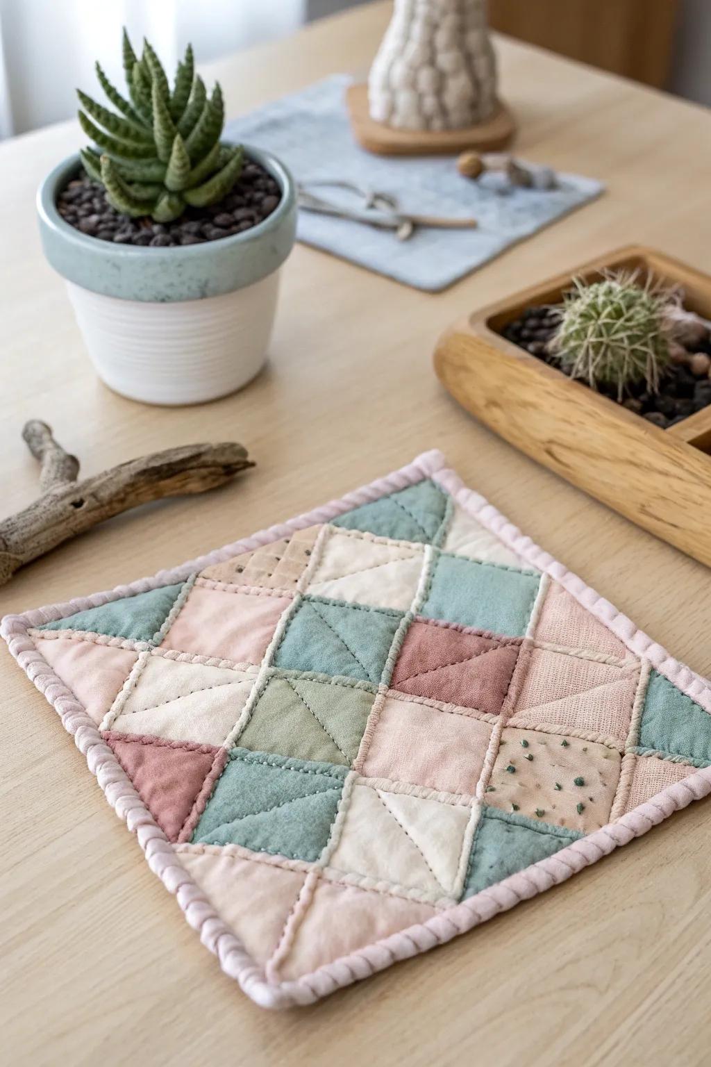 Use fabric scraps to sew a small quilted trivet. It’s a colorful way to protect your surfaces and a great way to use up those last bits of fabric.