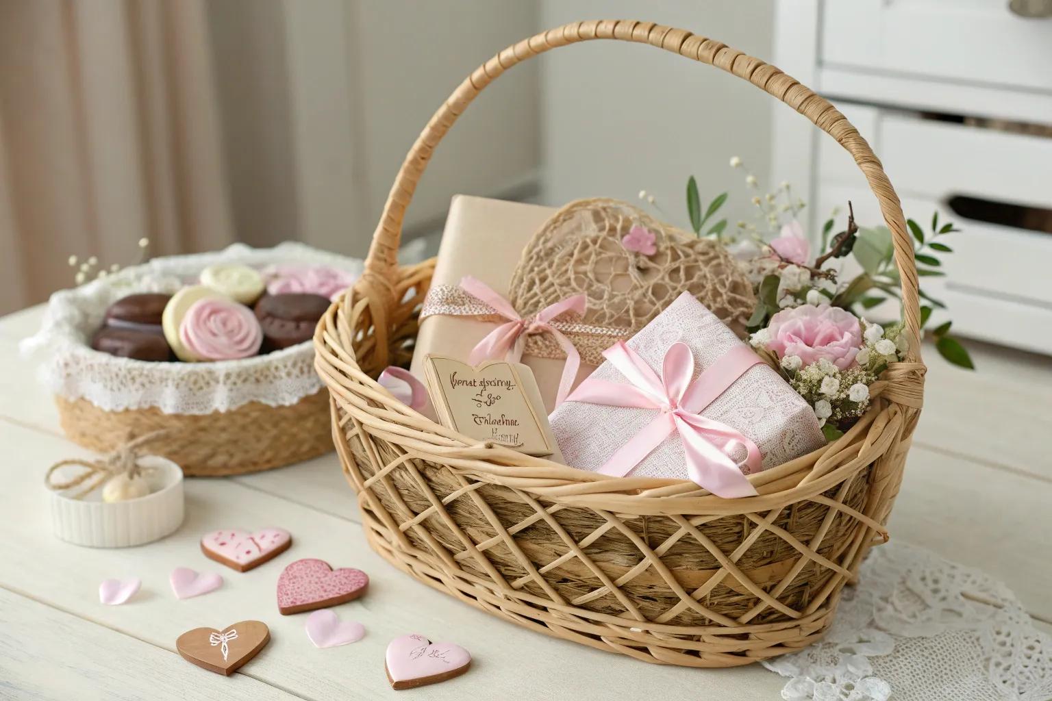 Fill a red or pink basket with an assortment of chocolates and candies, and tie it off with a festive ribbon. This classic is one of my favorite Valentine’s gift basket ideas, and it’s a sweet way to declare ‘I love you’ without saying a word—trust me, it’s a hit every time!
