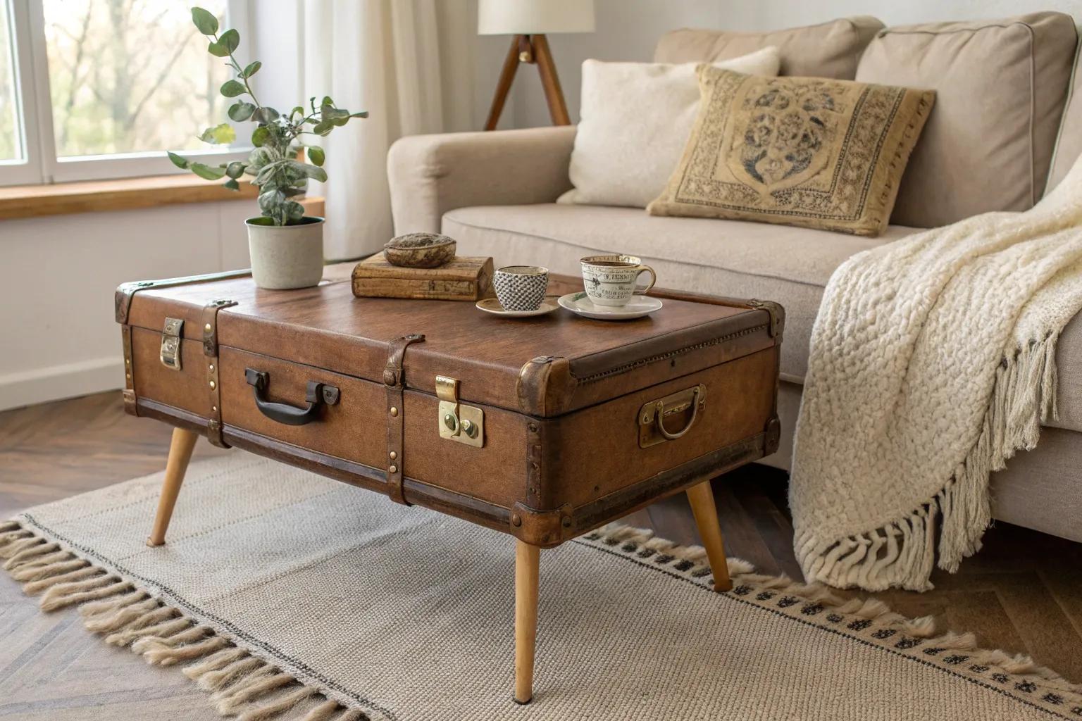 Transform a large vintage suitcase into a coffee table by adding some sturdy legs. Such vintage craft ideas are a conversation starter and offer a unique twist to the usual coffee table setup.