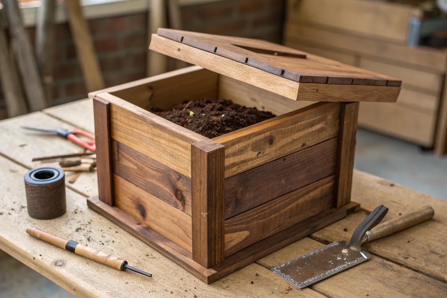 A wooden crate with a breathable fabric lining makes a rustic and effective worm bin. I love the natural look it adds to my patio garden!