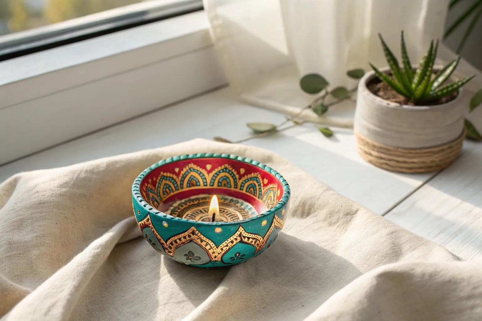 Incorporate traditional patterns such as florals and swirls onto your diyas. These designs add a touch of cultural elegance and are a favorite in my studio.