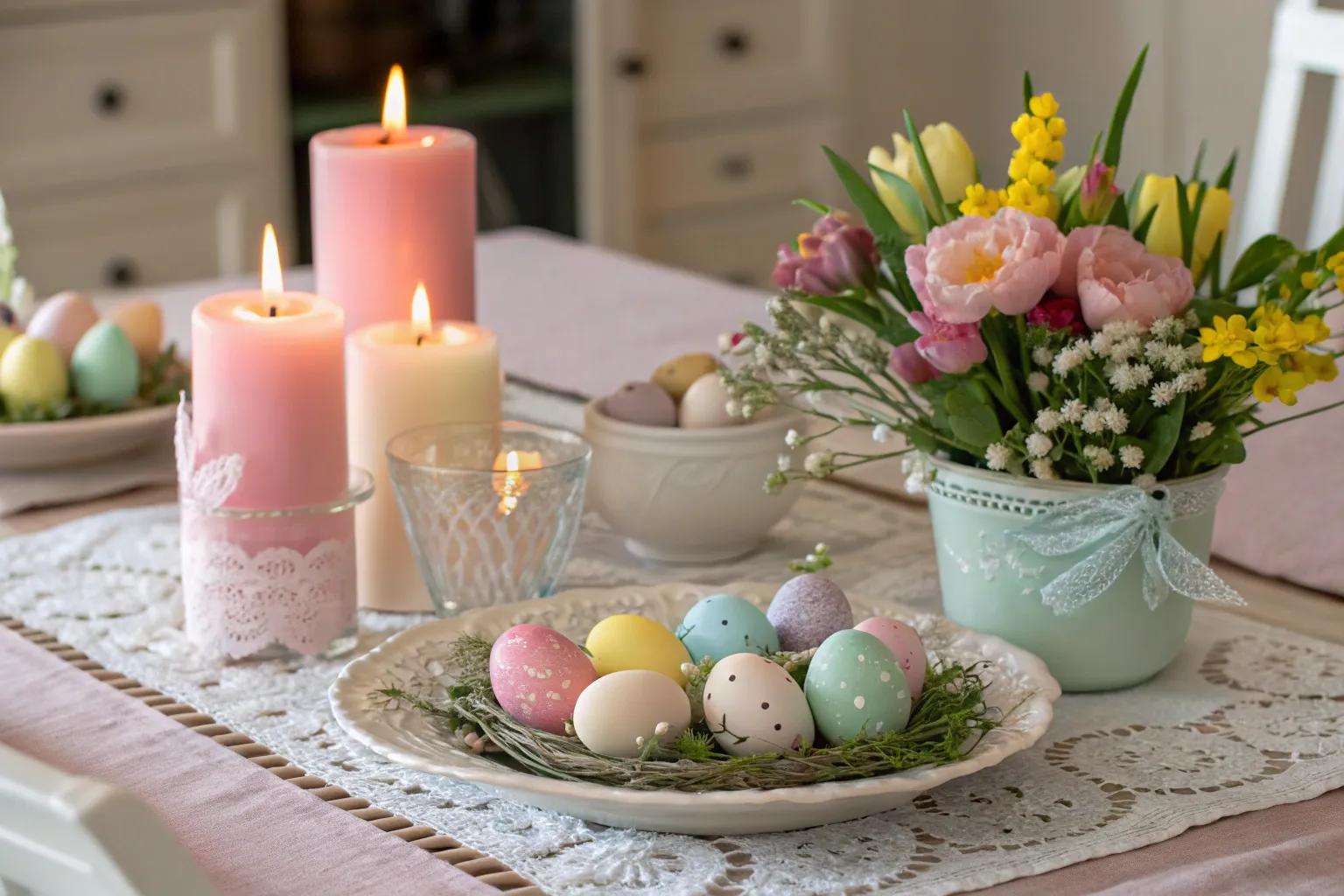 Create stunning centerpieces by combining candles with decorated eggs and floral accents. This is a foolproof way to impress guests at your Easter dinner.