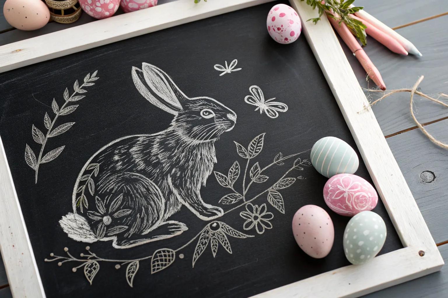 Draw a whimsical bunny on your chalkboard, giving it a fluffy tail and long ears for a playful touch. I love adding little details like a bow tie or a basket of eggs to bring the character to life.