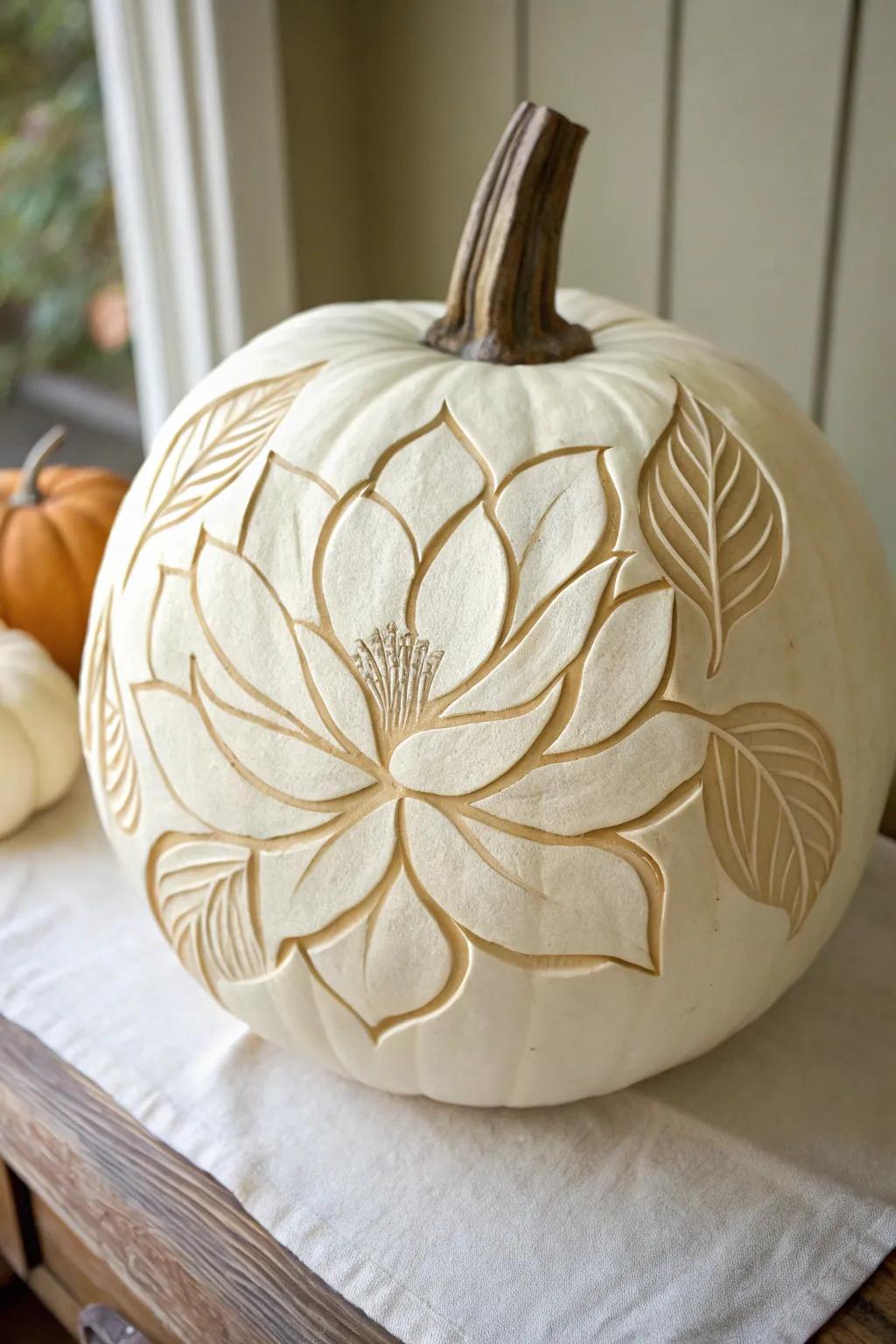Showcase the grandeur of a magnolia flower, with its large, graceful petals. This design is perfect for a sophisticated touch, even on a smaller gourd. For more inspiration, explore these little pumpkin carving ideas.