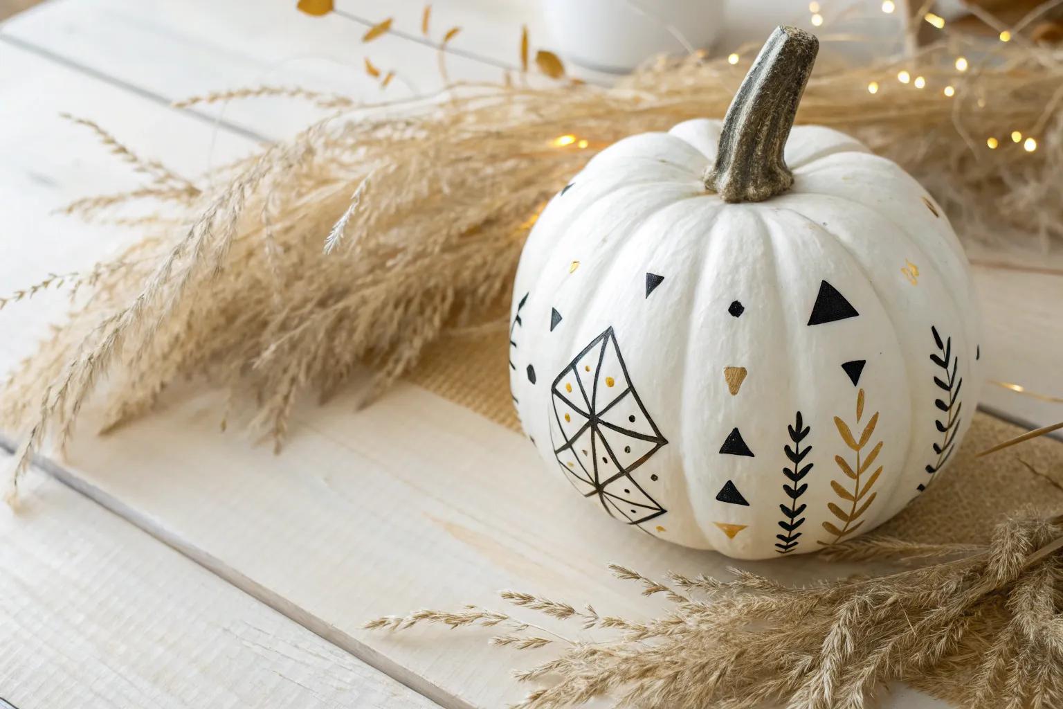 Add a modern touch with geometric shapes in gold or black on your pumpkin. This style works especially well for ceramic pumpkin painting projects. These patterns always make my mantel look chic and contemporary.