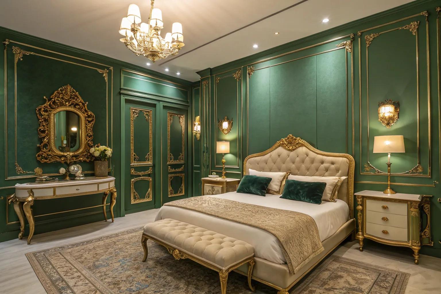 A green and gold canopy adds a regal touch to any bedroom. Similar to the opulent feel found in many purple master bedroom ideas, this feature creates a sense of luxury and a cozy retreat.