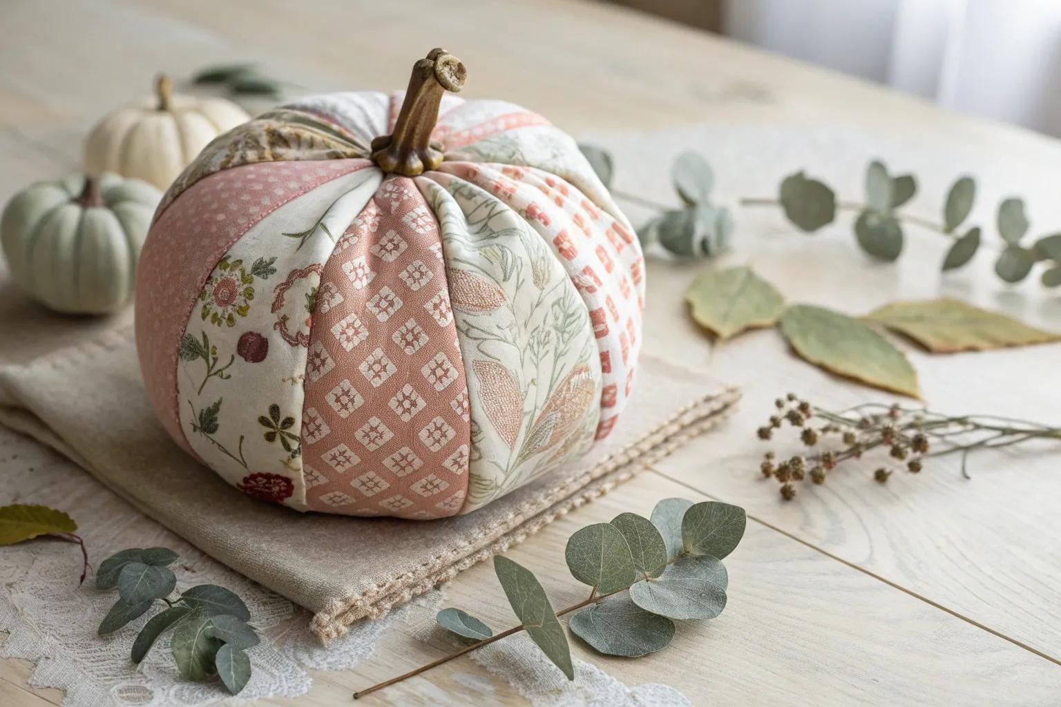 Combine multiple fabrics into a single patchwork pumpkin for a unique piece. Similar to using fabric, you can also try these ideas for decoupaging pumpkins with napkins. My first attempt turned out so quirky and fun, it quickly became a conversation starter!