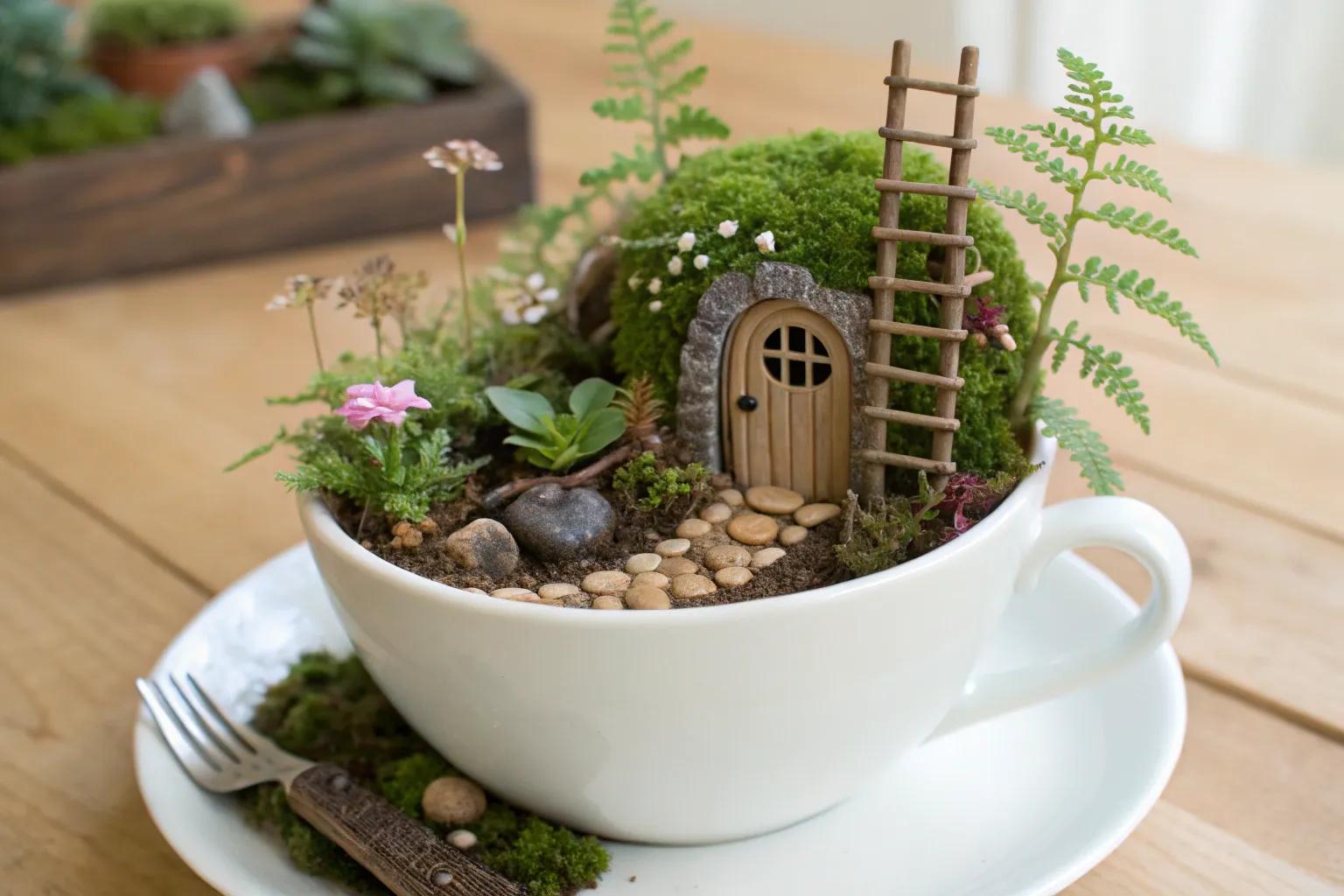 A delicate teacup can be the perfect home for a petite fairy garden, complete with wee succulents and tiny tea sets. I once created a teacup scene for a friend’s birthday, and it stole the show!