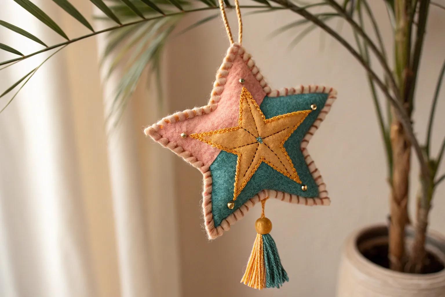 Cut out star shapes from felt and stitch them together with gold or silver thread. These felt stars shine brightly on any tree. Discover more DIY Christmas ornament ideas to complement them.