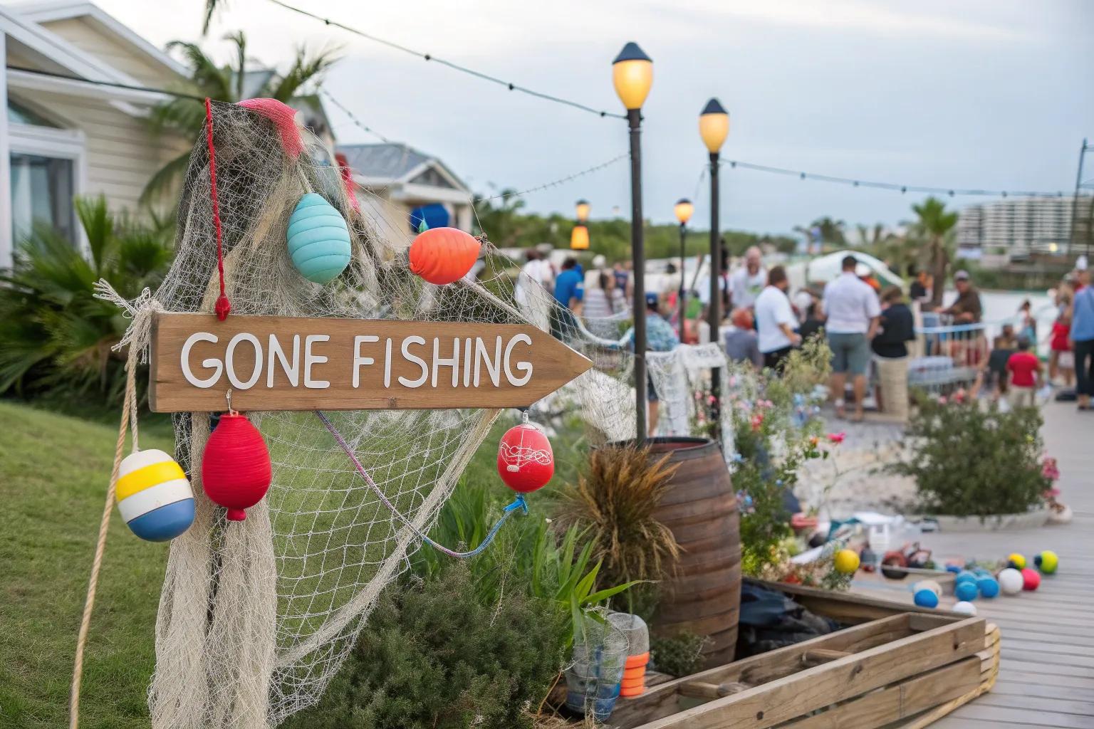 Welcome guests with a hand-painted ‘Gone Fishing’ sign at the entrance. I crafted mine on a piece of reclaimed wood for a rustic touch. It’s a friendly way to greet guests and steer them into the fishing fun.