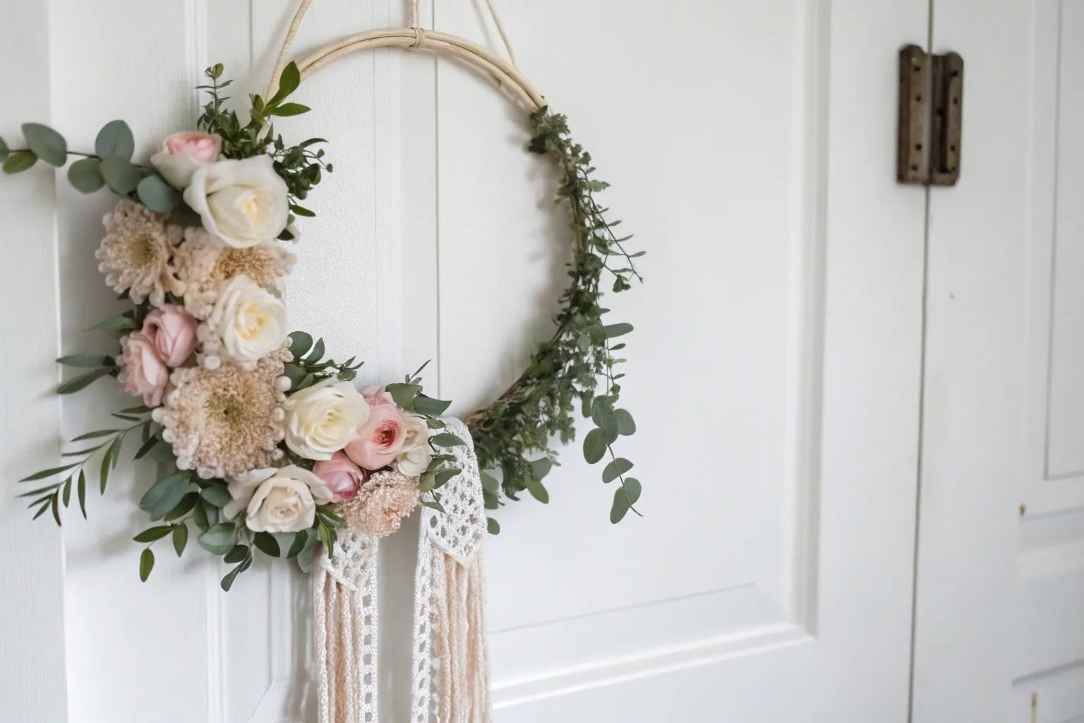 Embroidery hoops aren’t just for fabric; they make a perfect base for a simple floral display. Wrap faux flowers around the hoop and hang it for a simple yet elegant decoration.